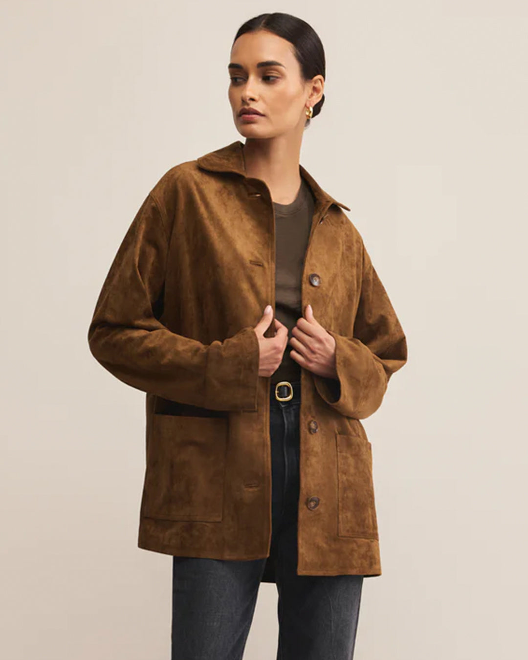 Equal parts rugged and refined. This statement coat brings a cool, clean finish in soft faux suede with patch pockets and an easy, relaxed shape.