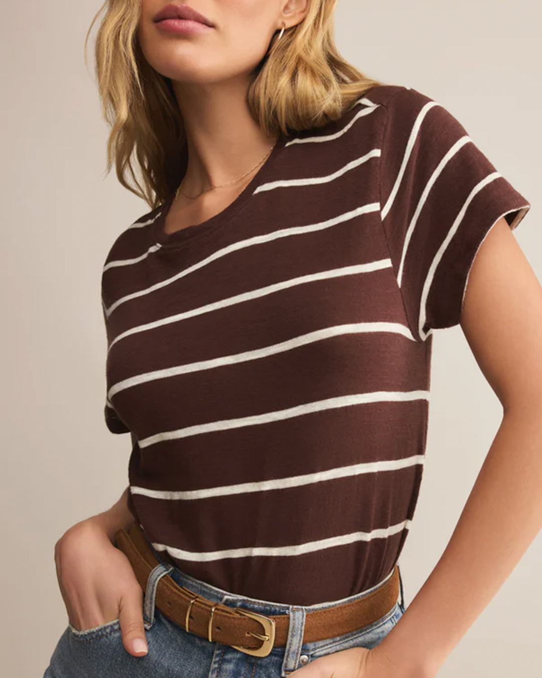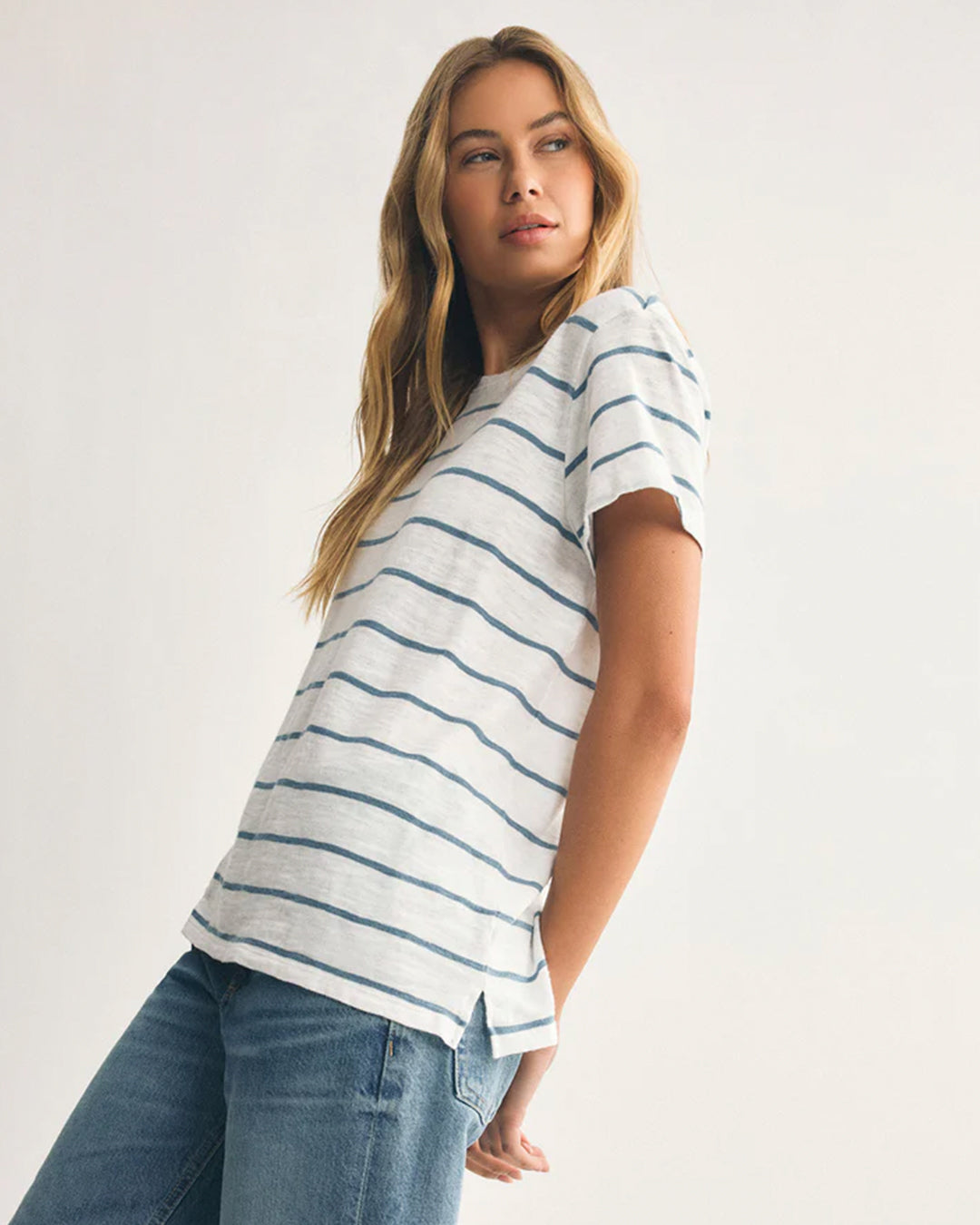Made from our premium brushed slub jersey, this crew neck tee is soft, lightweight, and endlessly wearable. Classic stripes and a relaxed, tuckable fit make it a go-to for those “what do I wear” days.