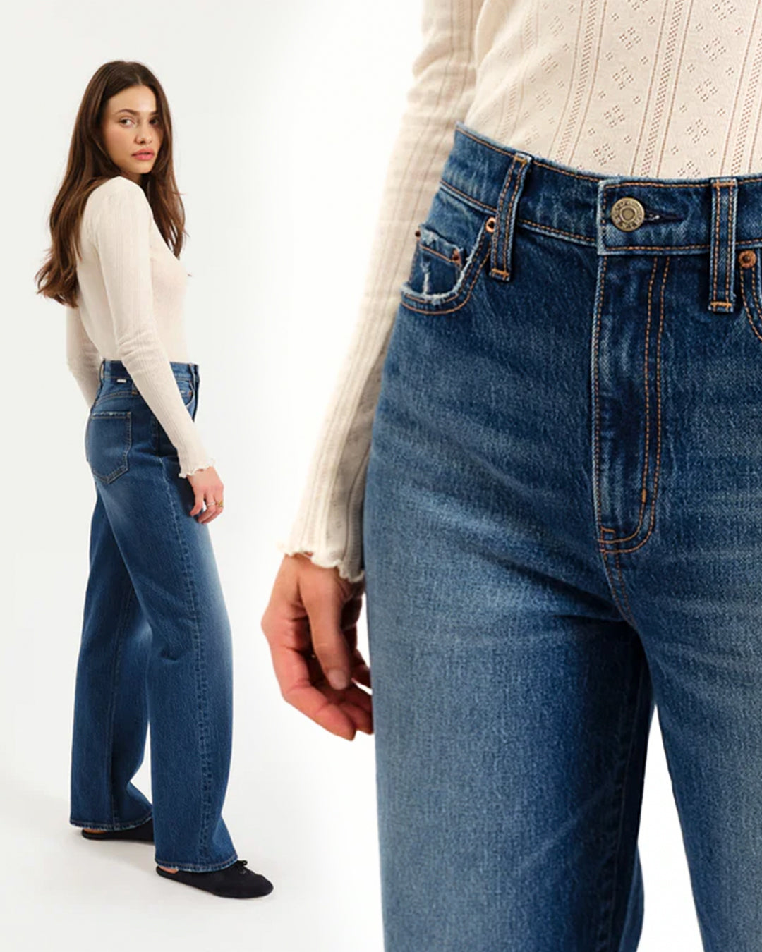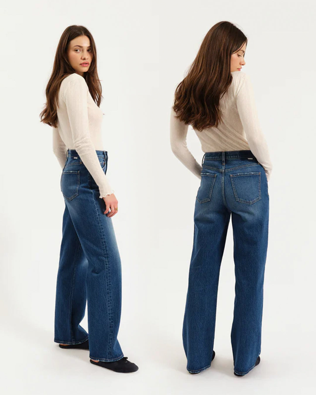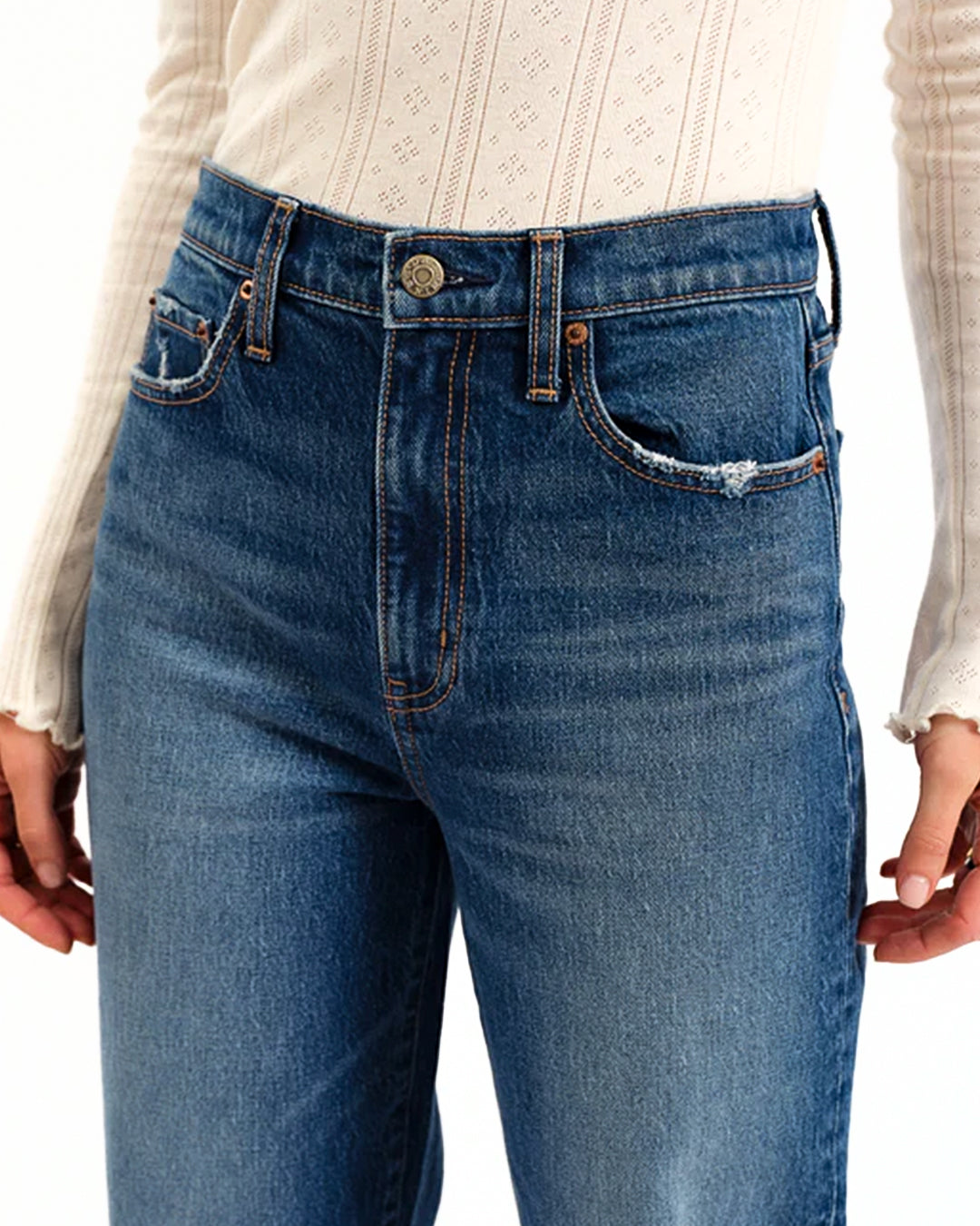 The City Straight in Bright Blue is a high rise straight leg jean in a timeless dark blue wash. Gently frayed hems and straight lines make this a versatile jean for any occasion. Constructed from our Tough Love fabric, this pair is mostly rigid but yields to your body in all the right ways.