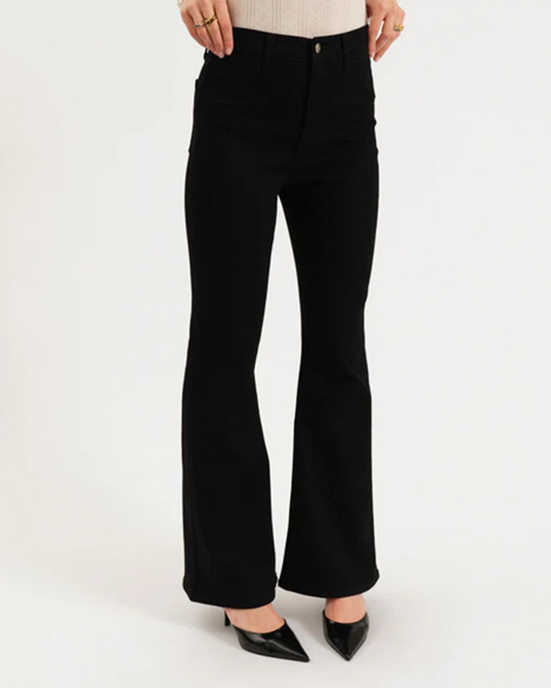 The Sunset Flare in After Party is a high rise flared jean in a clean black wash. This flattering fit hugs you at the waist and flares dramatically from knee to ankle. Constructed from our Hug fabric, this jean is flexible enough to hug your body, yet heavy enough to cinch you in.