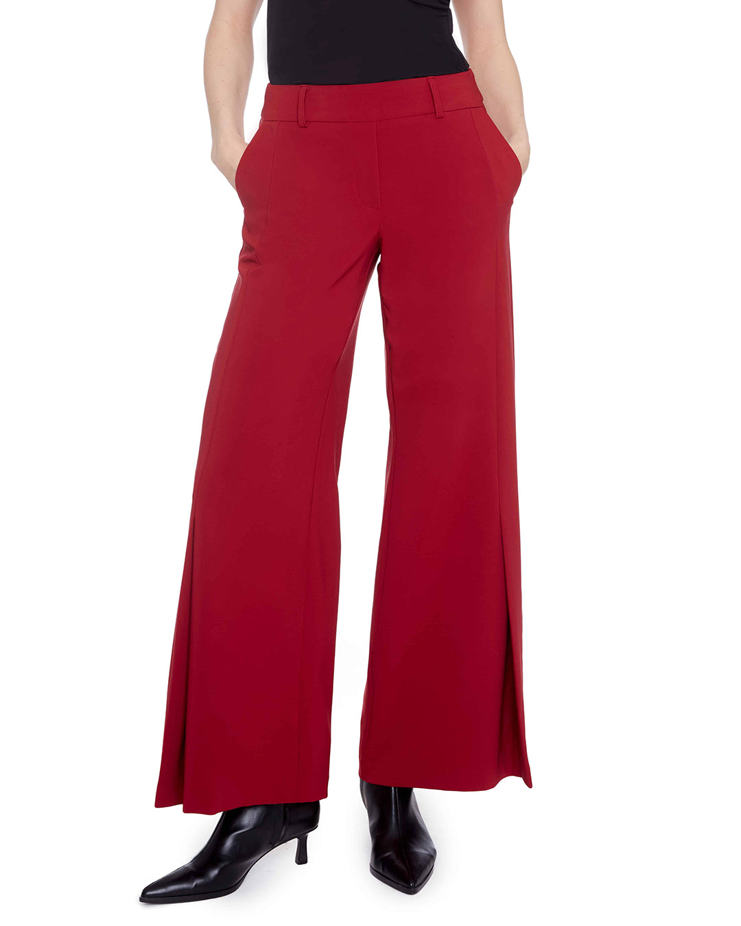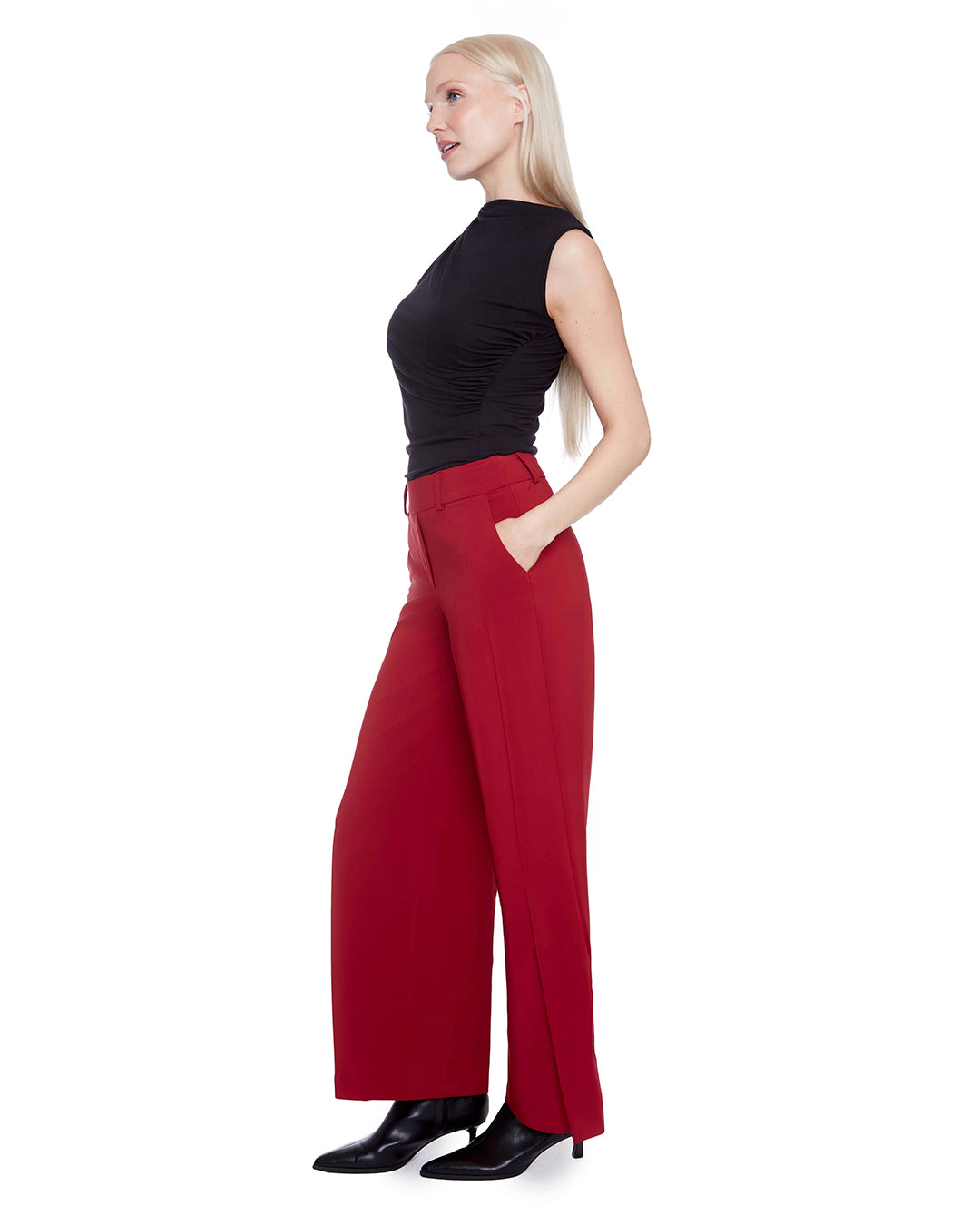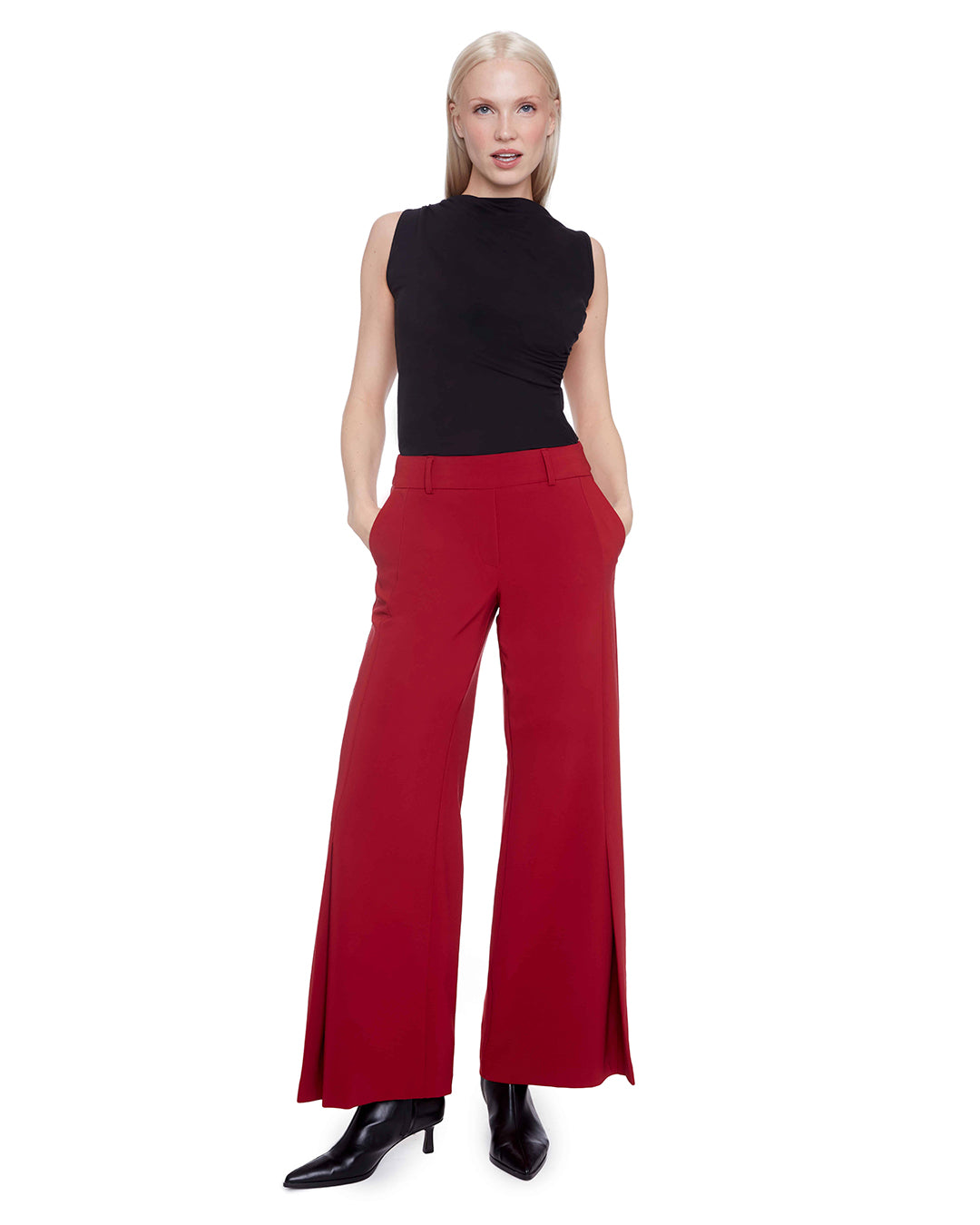 The classic wide leg gets an edgy upgrade with unexpected front slits, injecting a sharp elegance that elevates the languid look to epic proportions. Sophisticated tailoring ups the versatility factor with a polished office-appropriate spin.