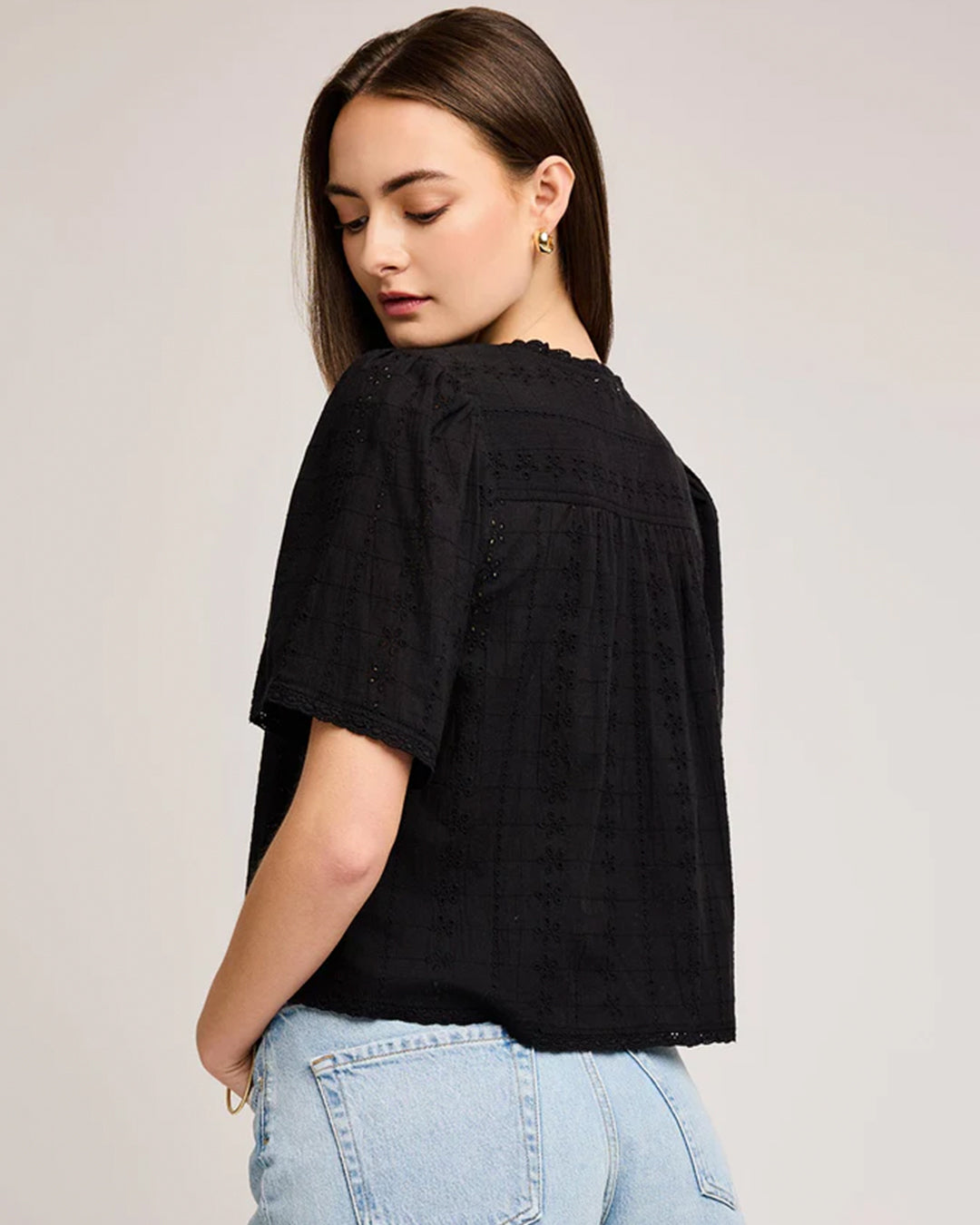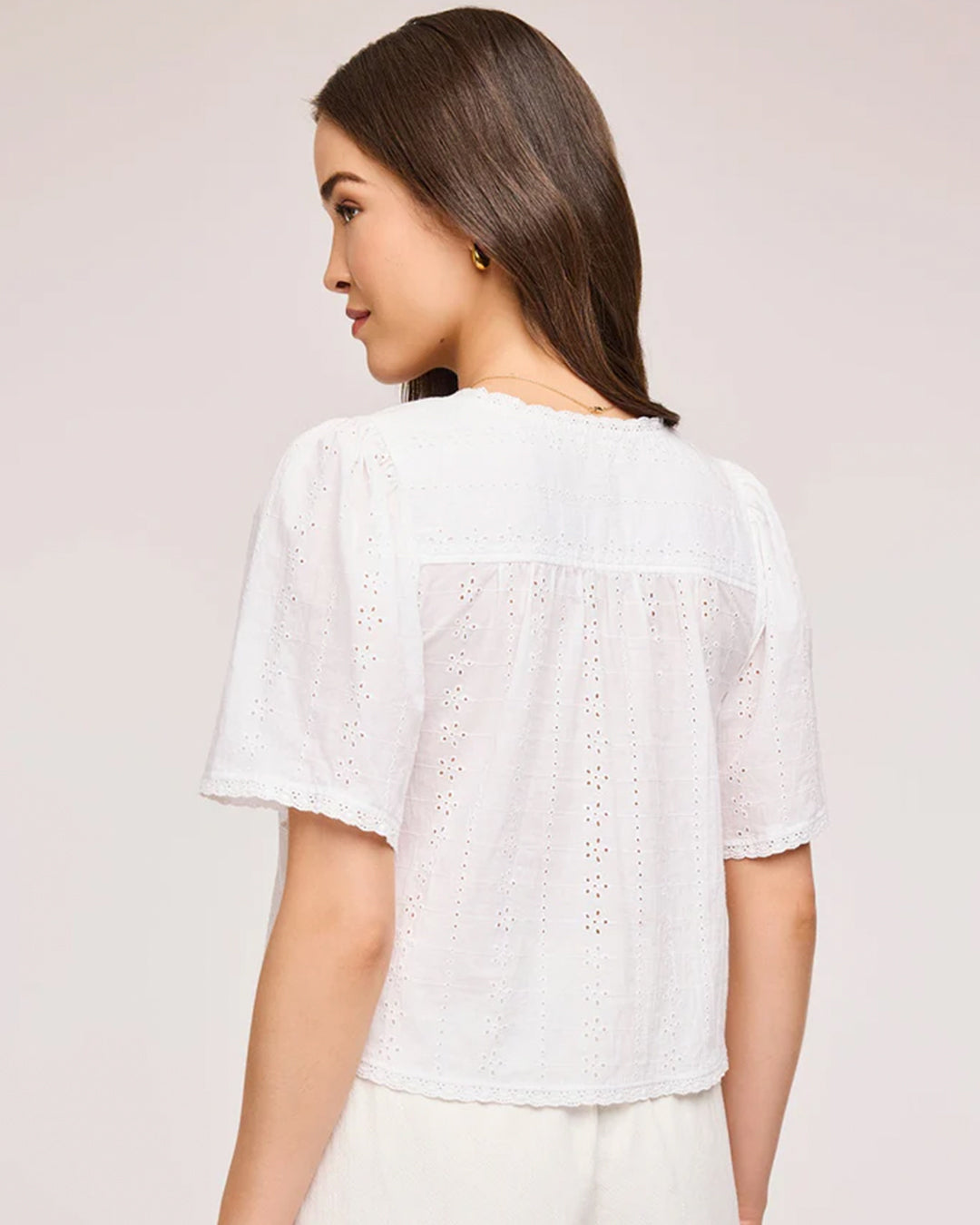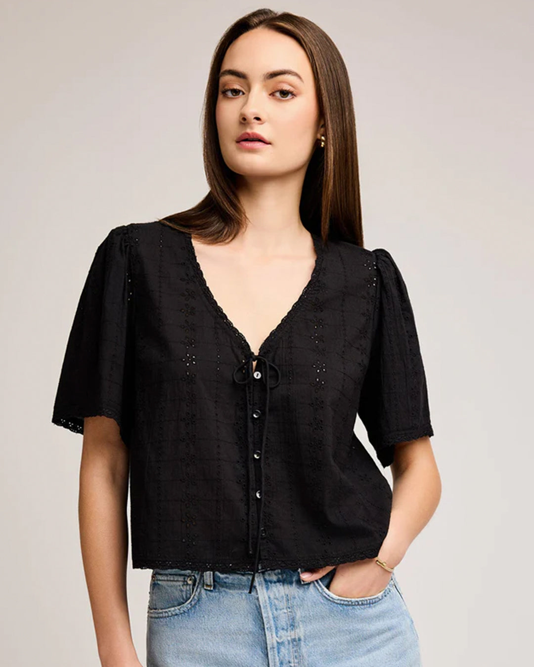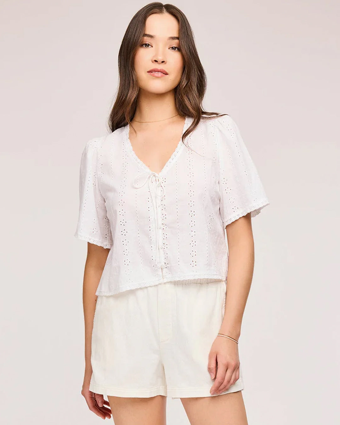 The Jessa top is made of cotton fabric with floral eyelet embroidery. Features include a button placket with tie and trim detailing along the hem and neckline.