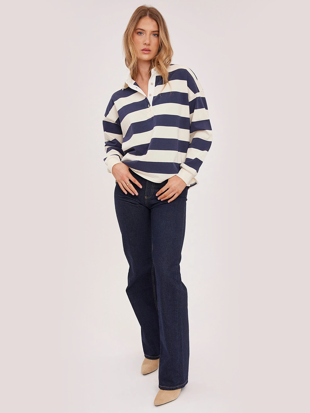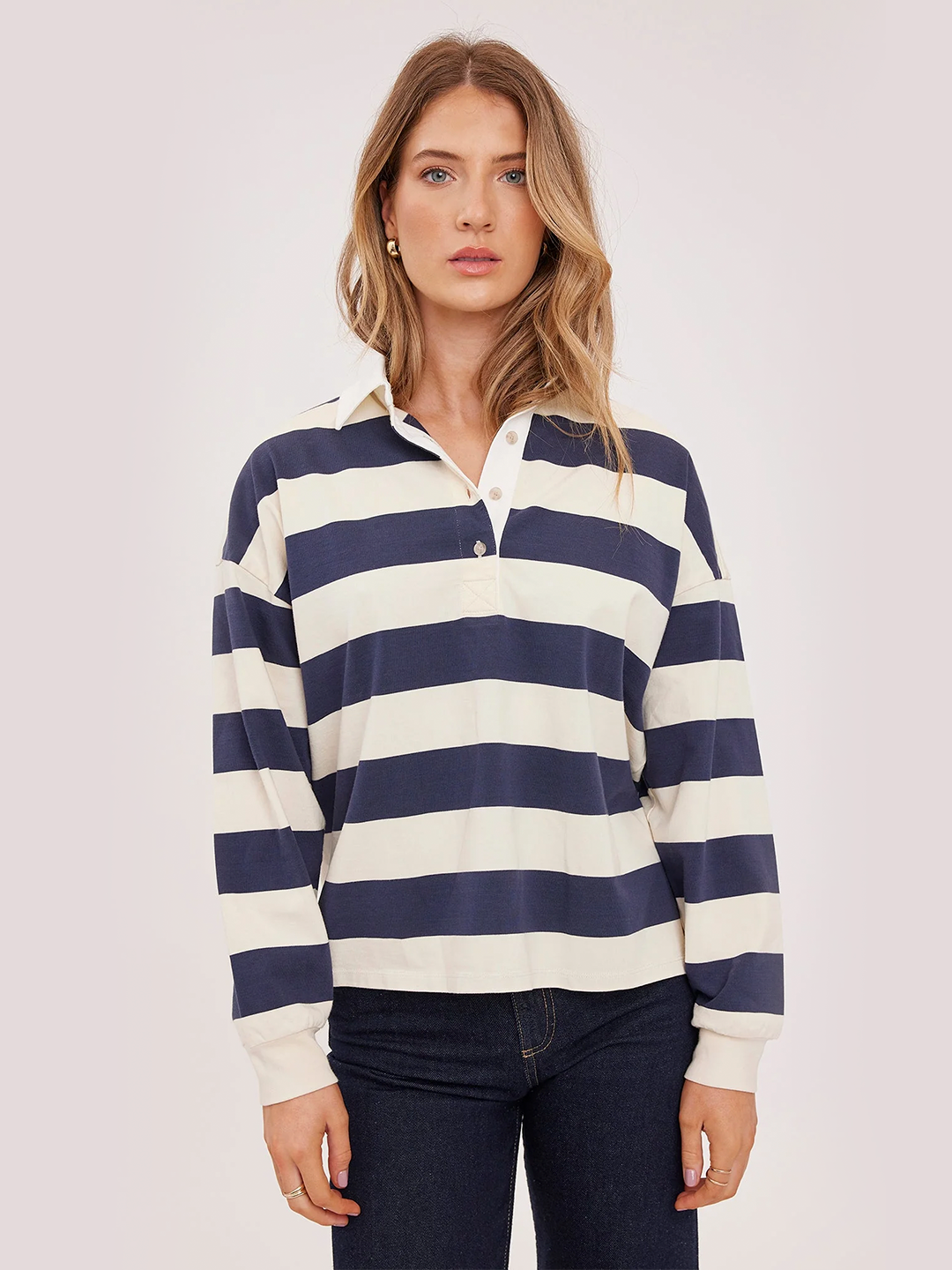 The Britt shirt is made of a cotton jersey with a classic rugby stripe. Features include a contrast collar, half placket button closure, and side slits.