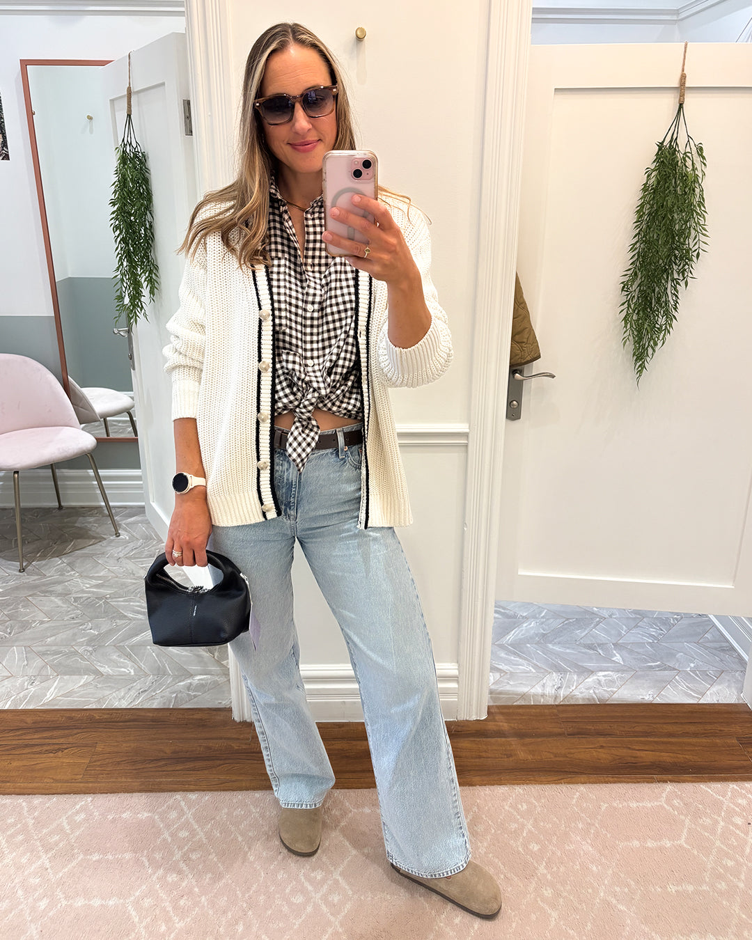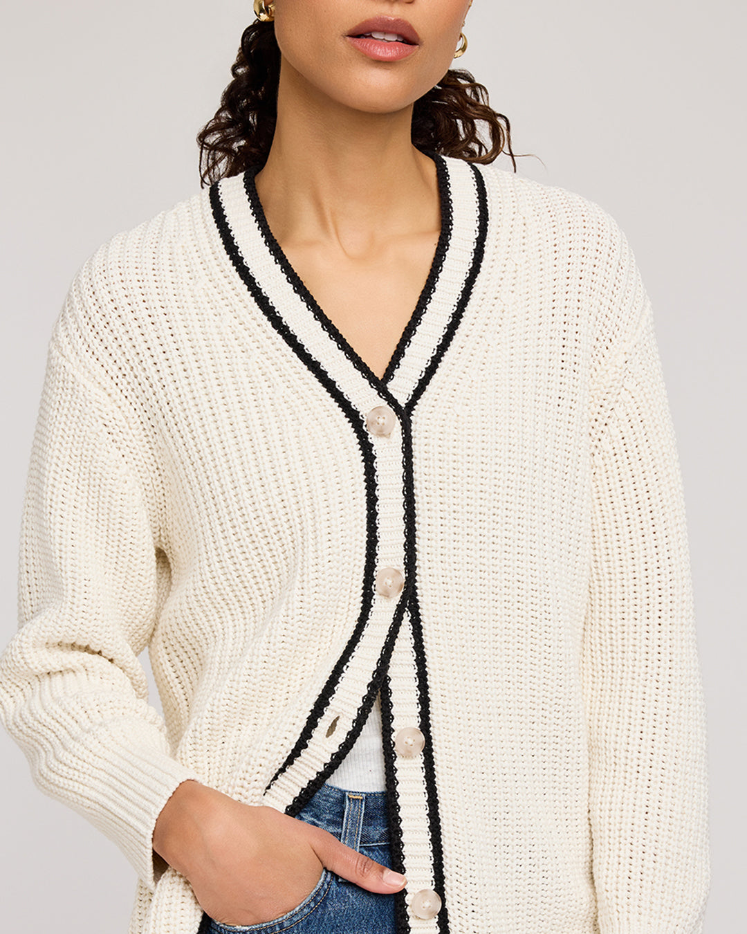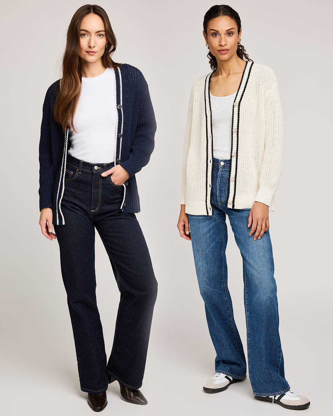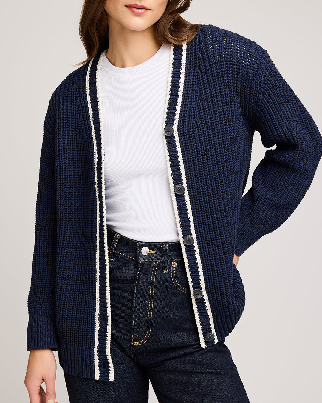 The Viola cardigan is made of a cotton blend yarn in a half cardigan stitch. Features include a front button closure with a contrast stripe detail.