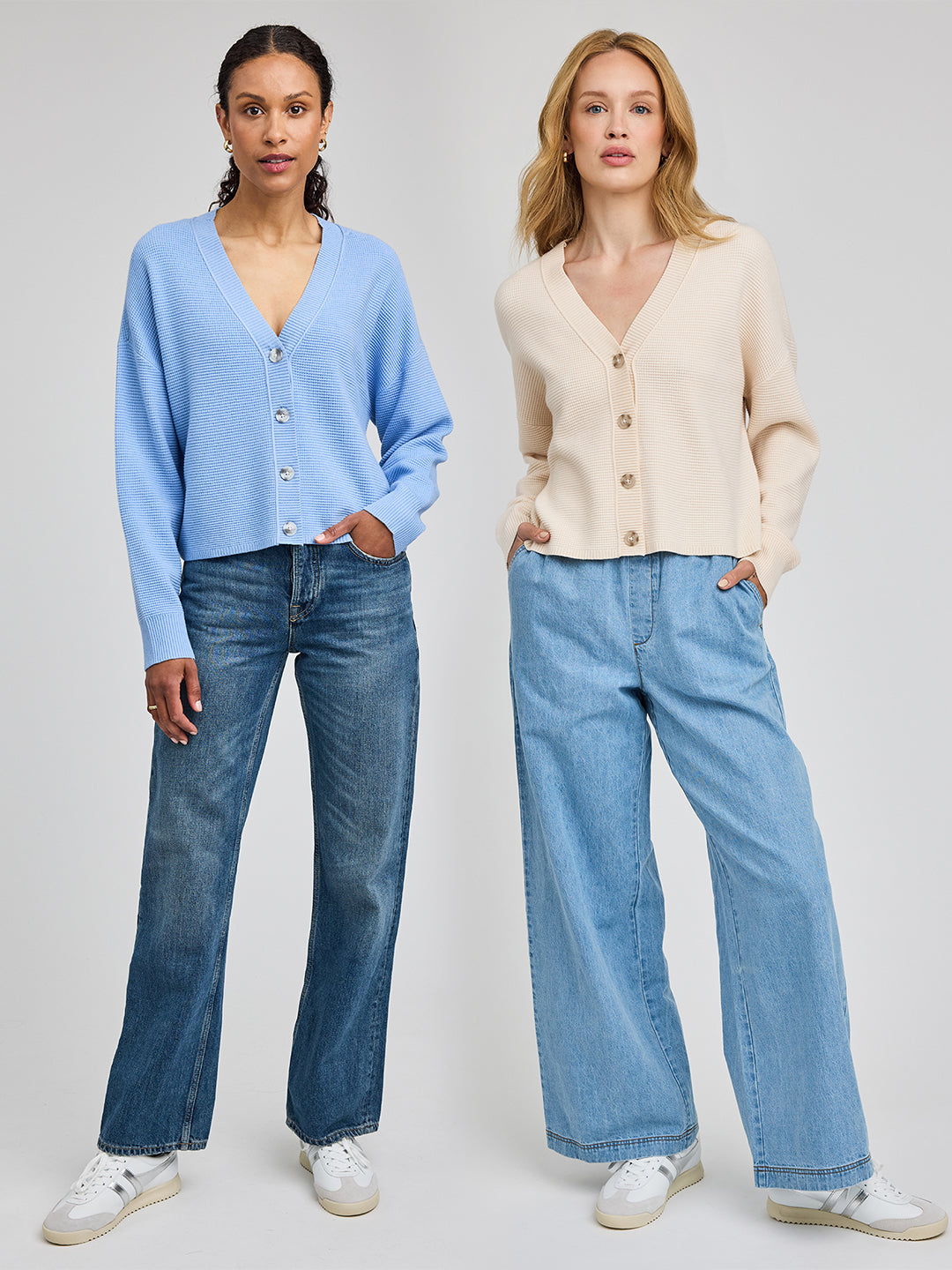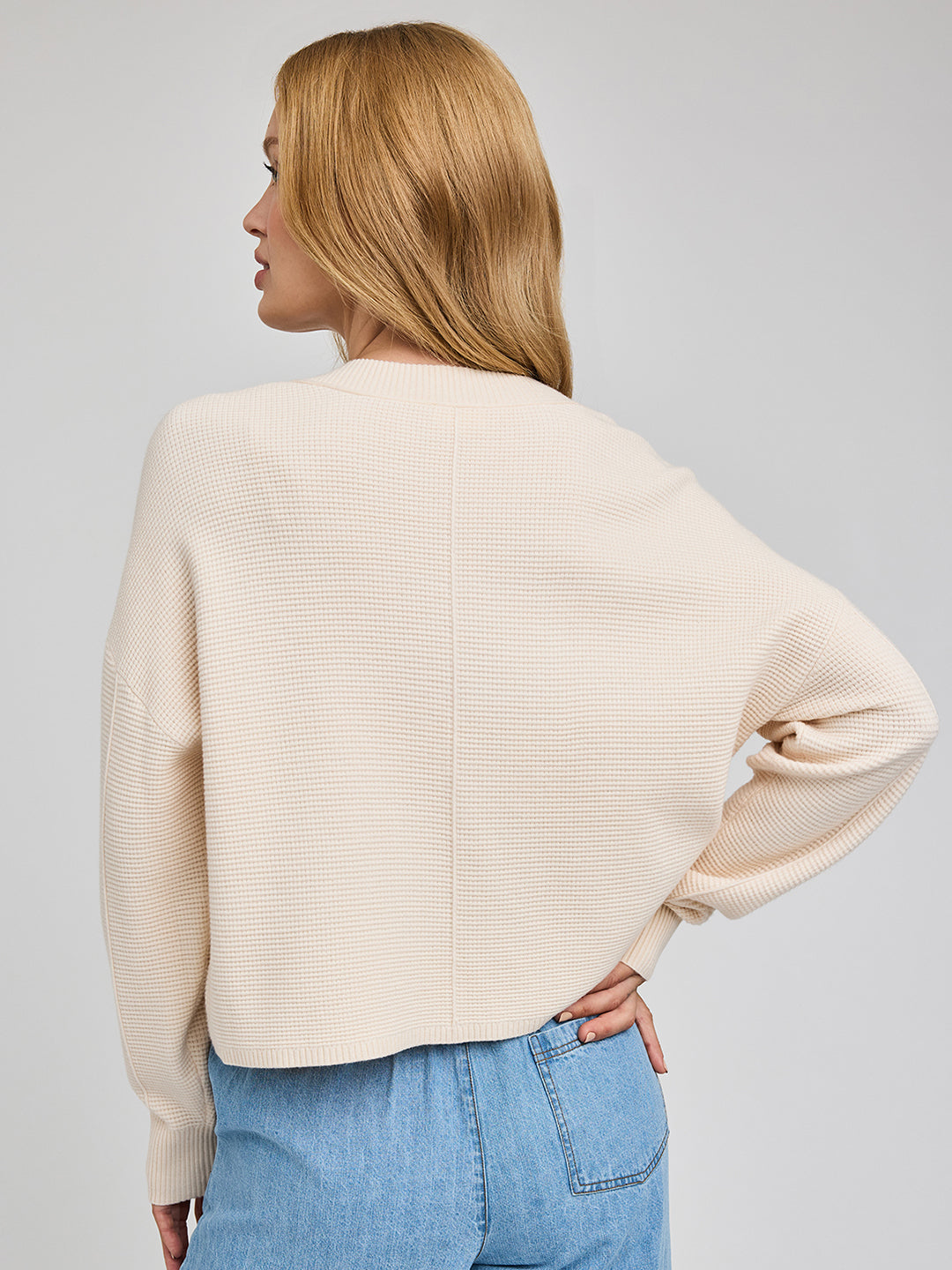 The Joyce cardigan is made of a soft yarn in a waffle stitch pattern. Features include a front button closure and exposed seam details.