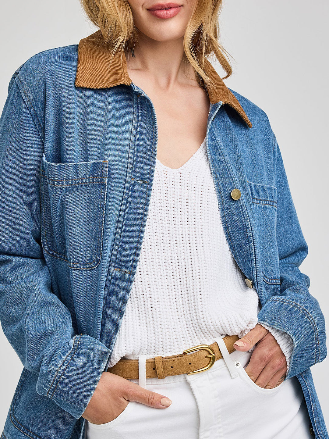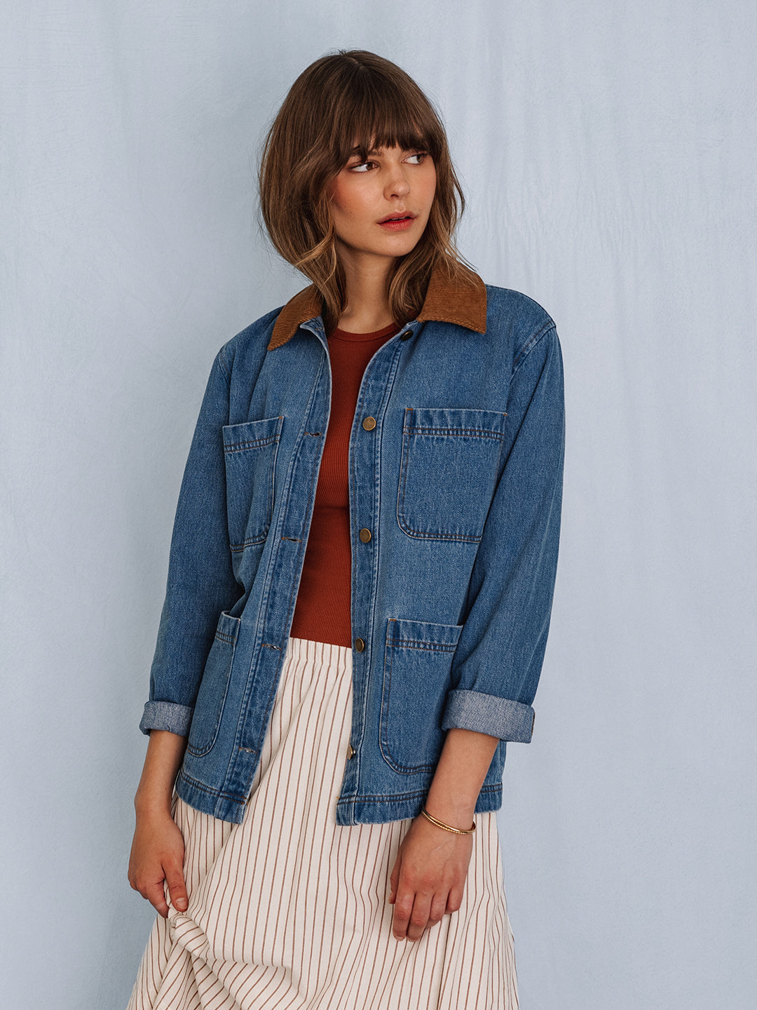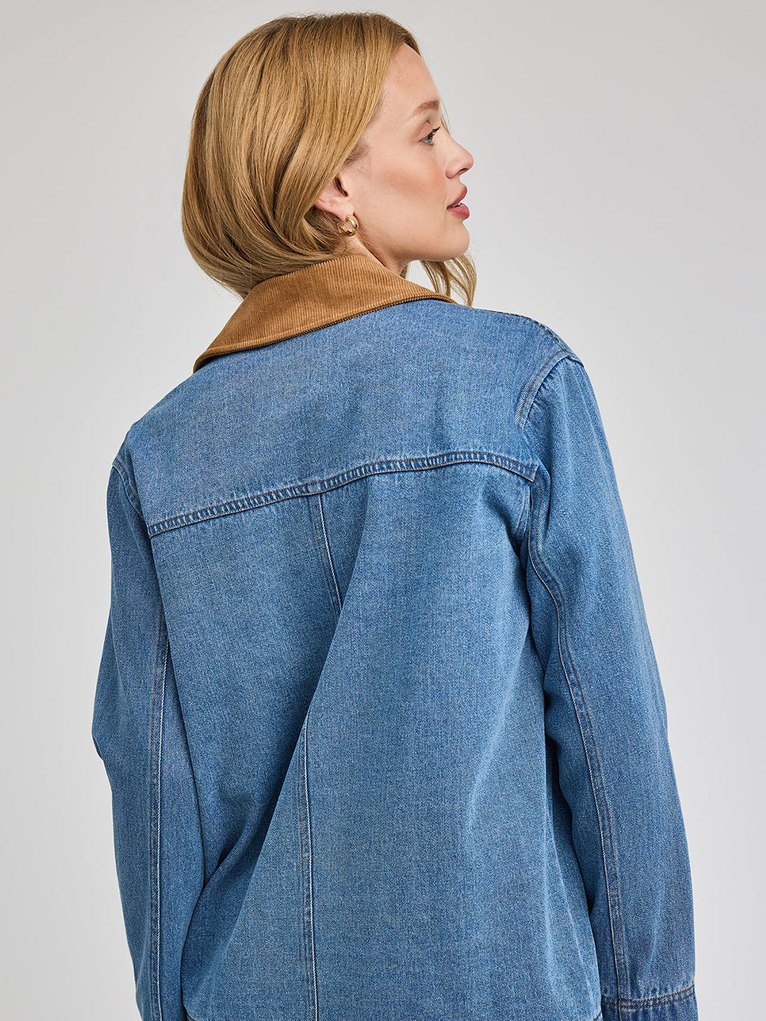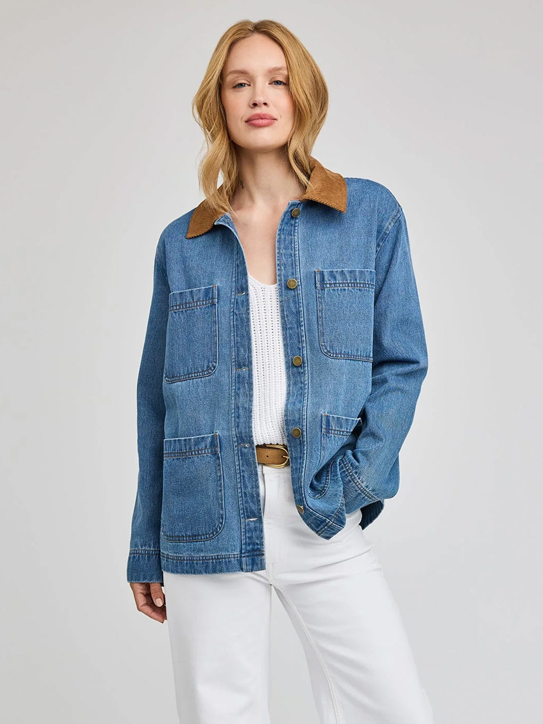 The Flynn jacket is made of a heavy weight denim fabric that has been specially washed for a perfectly lived-in look. The effortless silhouette features patch pockets and a contrast corduroy collar.