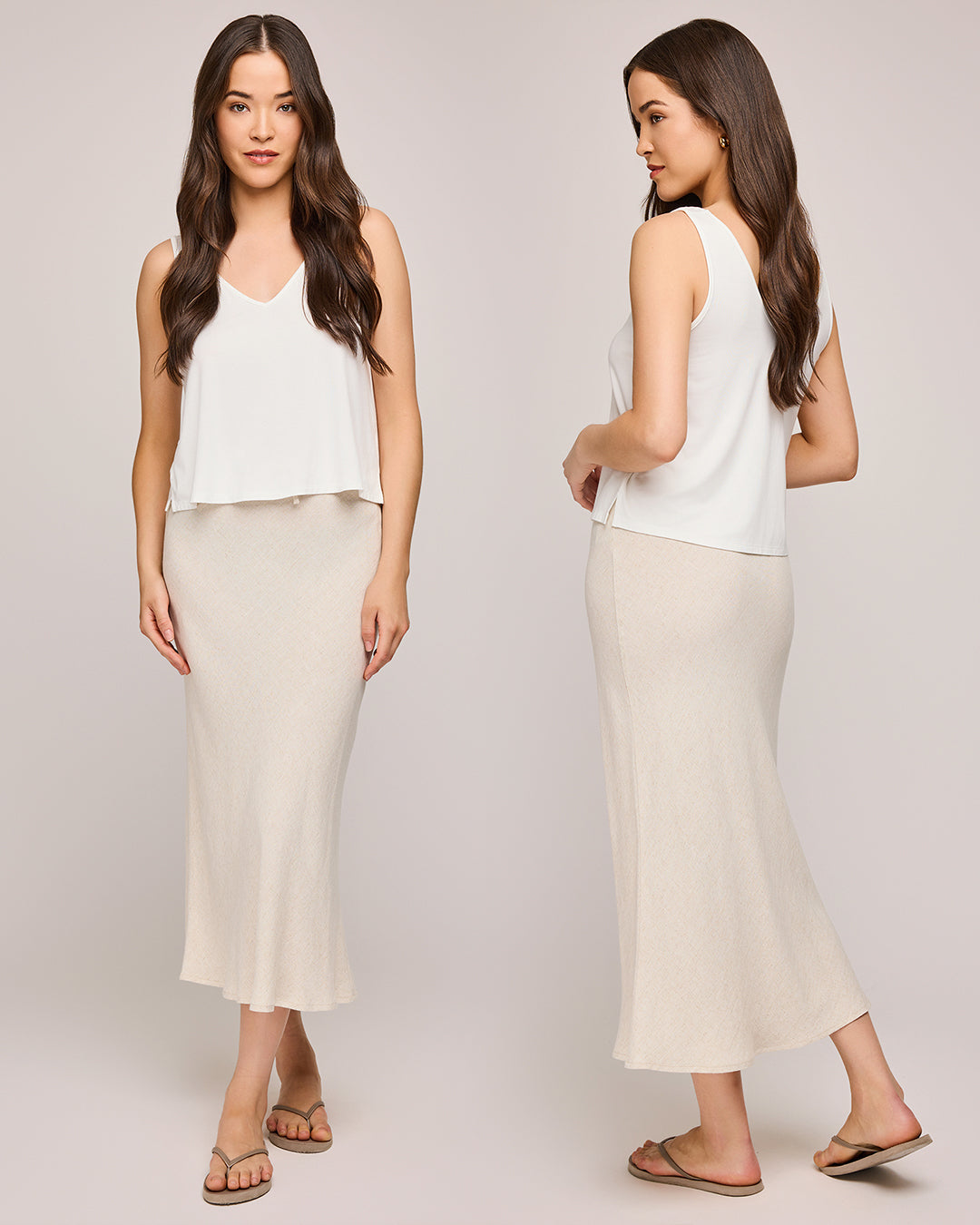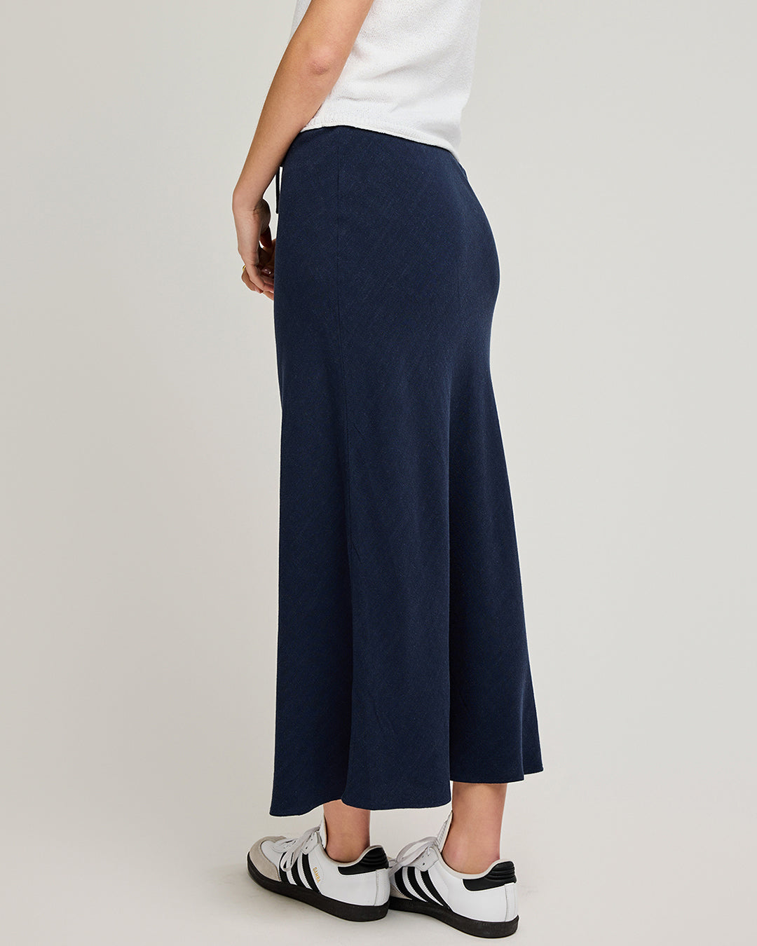 The Cassia skirt is made of a bias cut linen blend fabric that drapes perfectly. The drawcord can be adjusted to be worn mid or high rise for styling versatility.