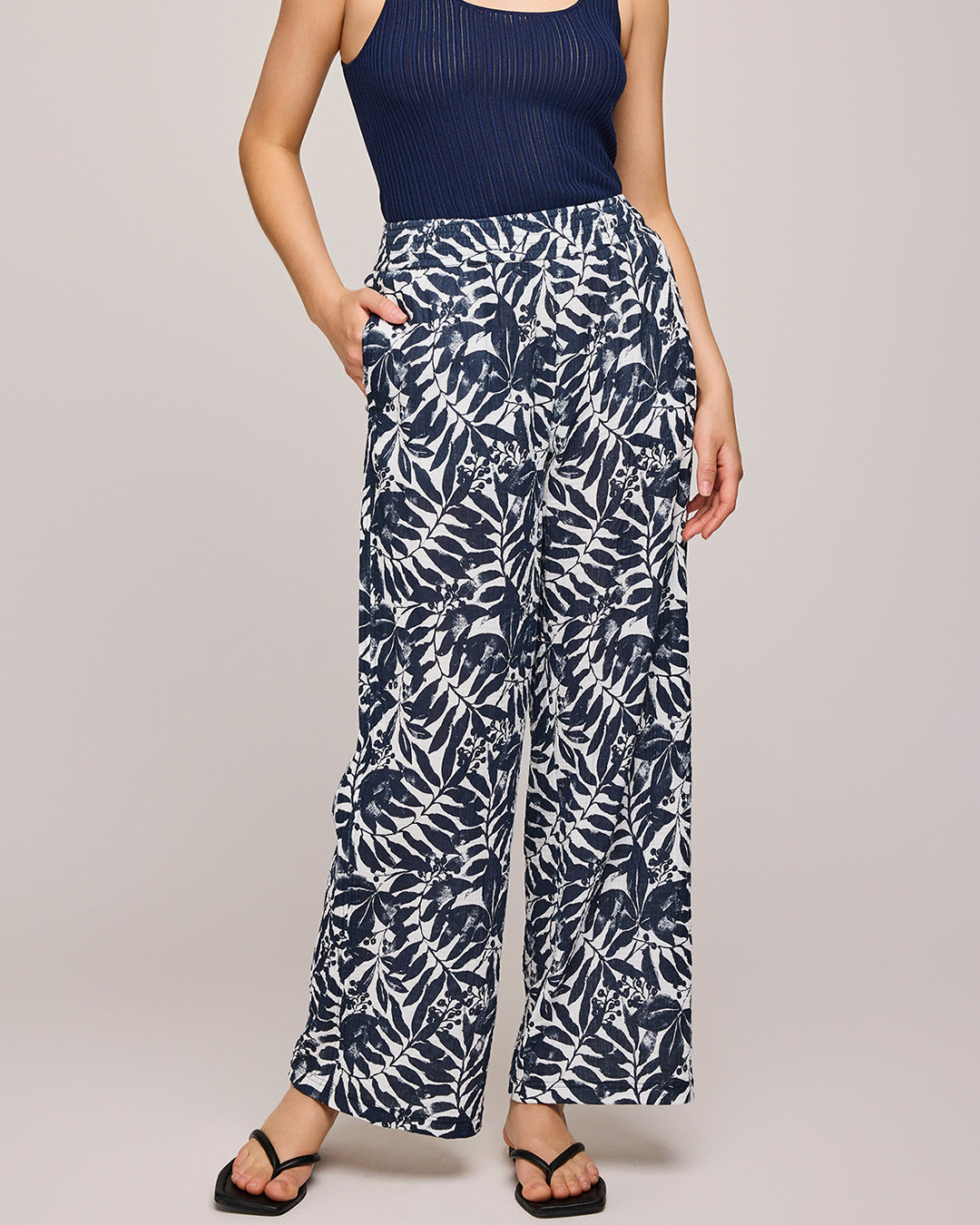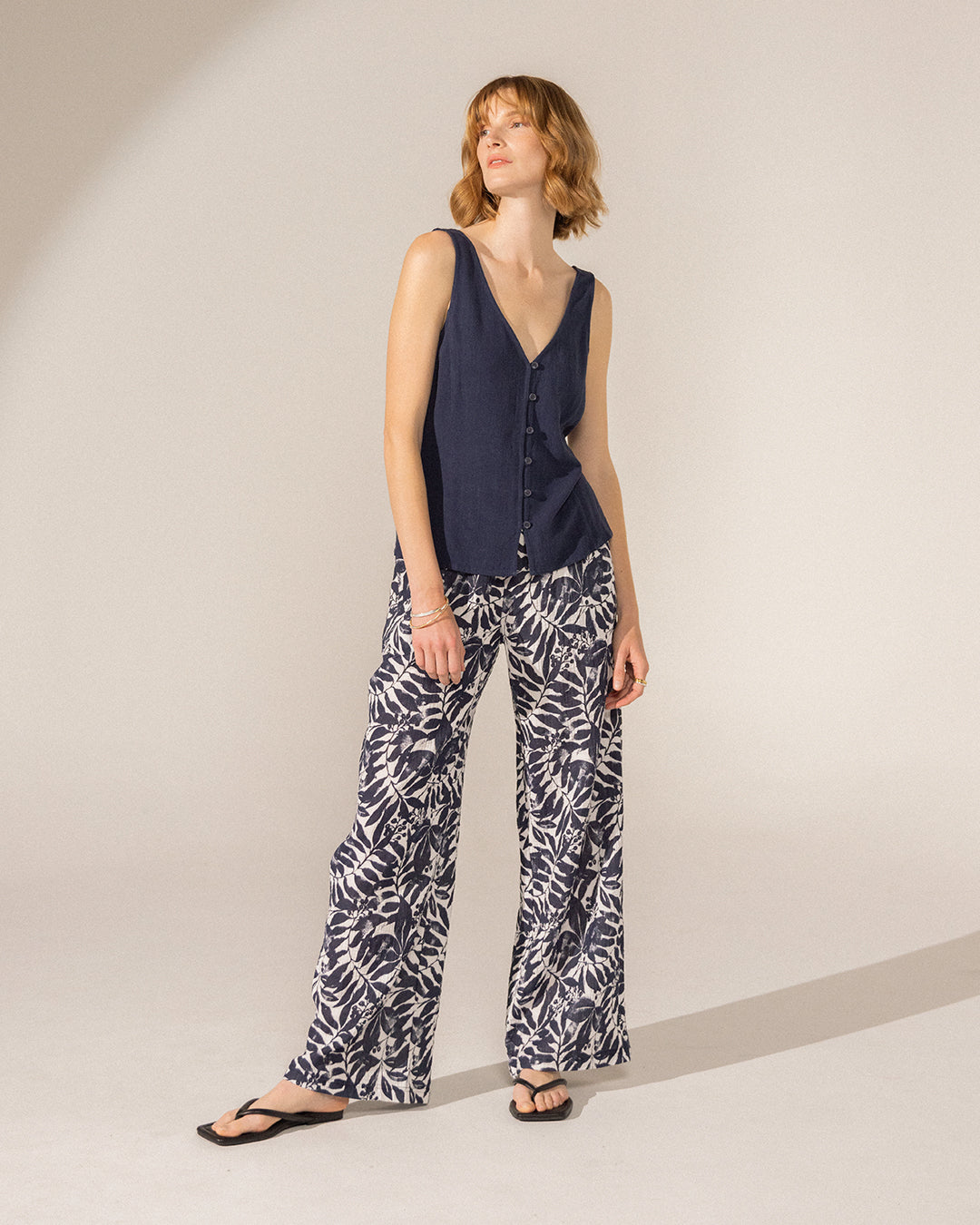 The Adelaide pant is made of an airy double cotton gauze fabric. Features include a smocked waistband and inseam pockets.