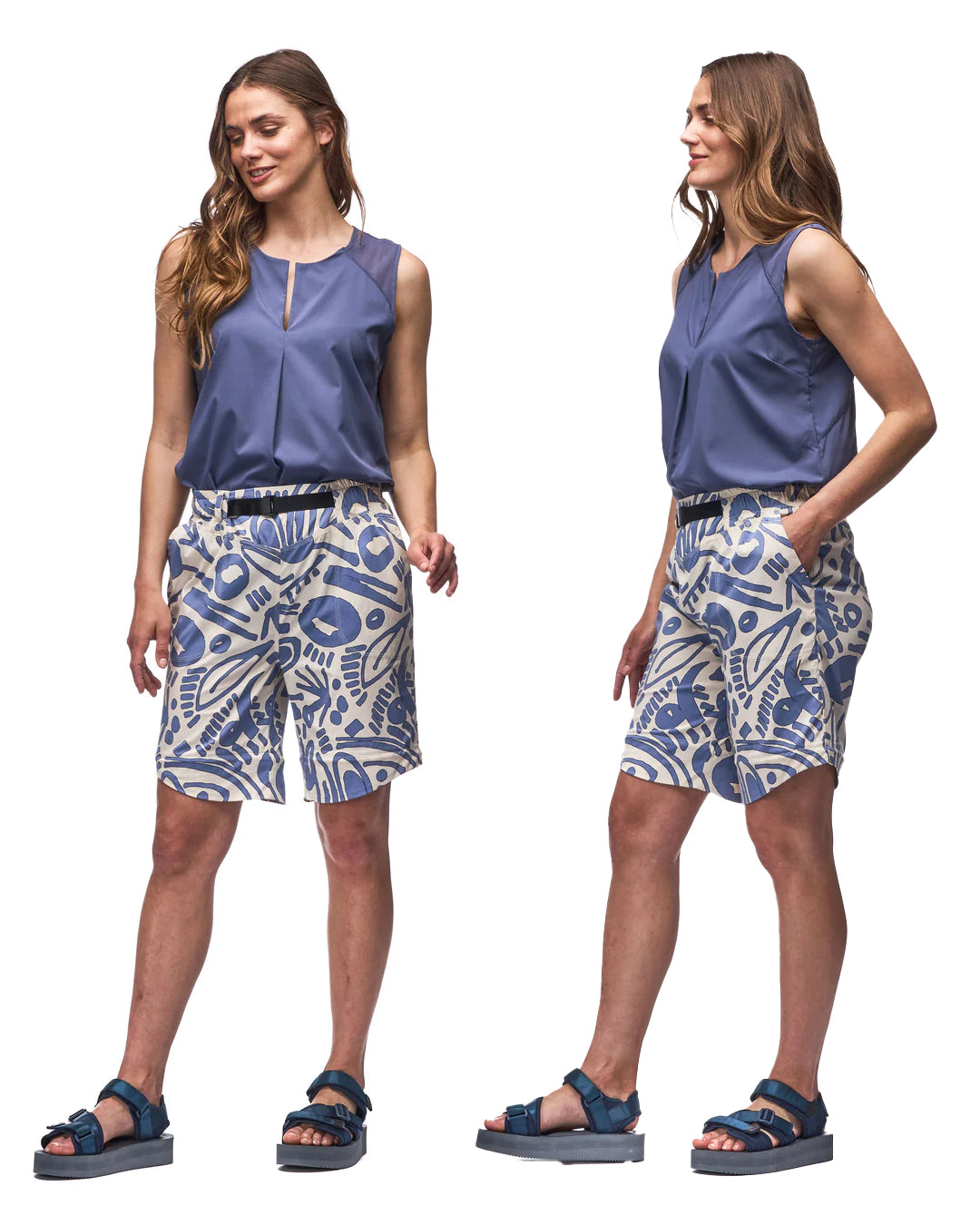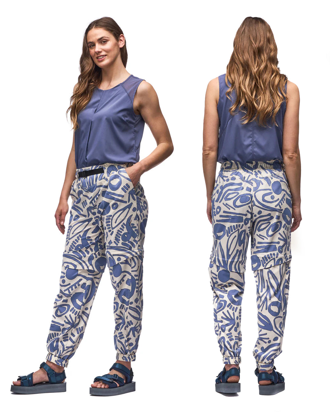 Adjustable waist with integrated belt. Loose fit. Pants designed to reach the ankle. Mid-thigh shorts.