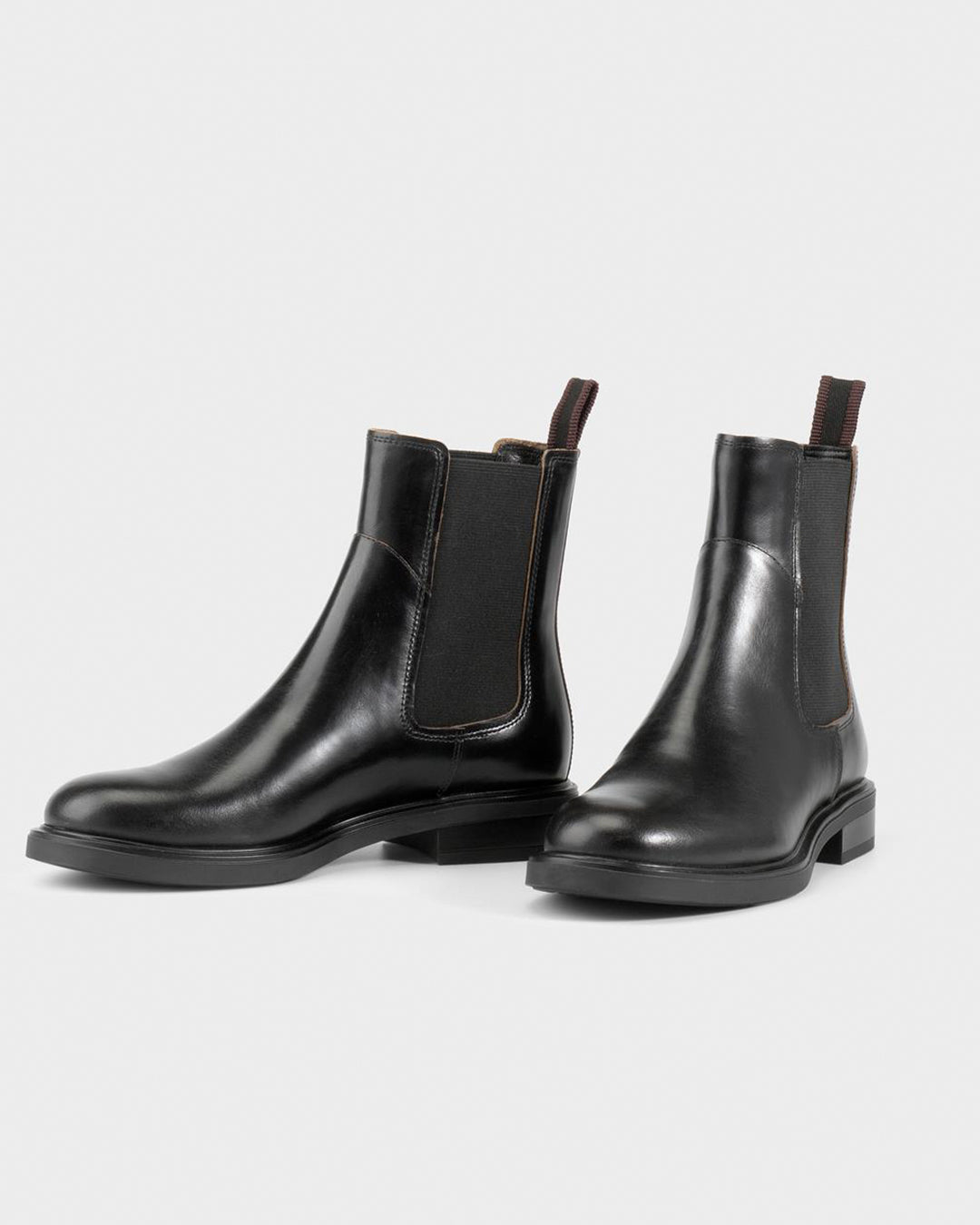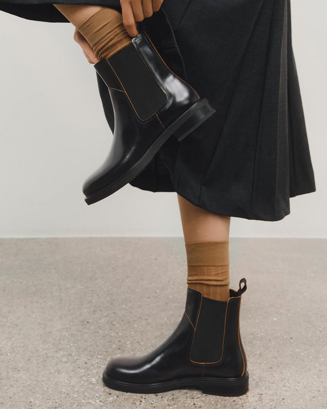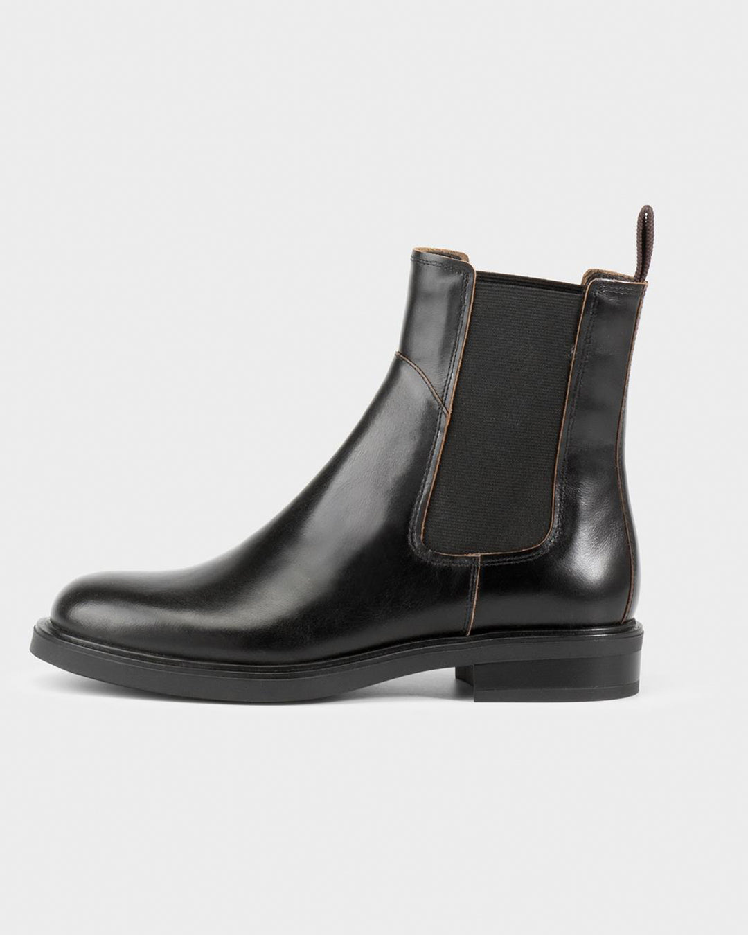 Edition Freya offers a fresh take on formal footwear. The softly rounded silhouette strikes a refined balance; dressy yet grounded. The chelsea boot is crafted from black leather with raw contrasting edges.