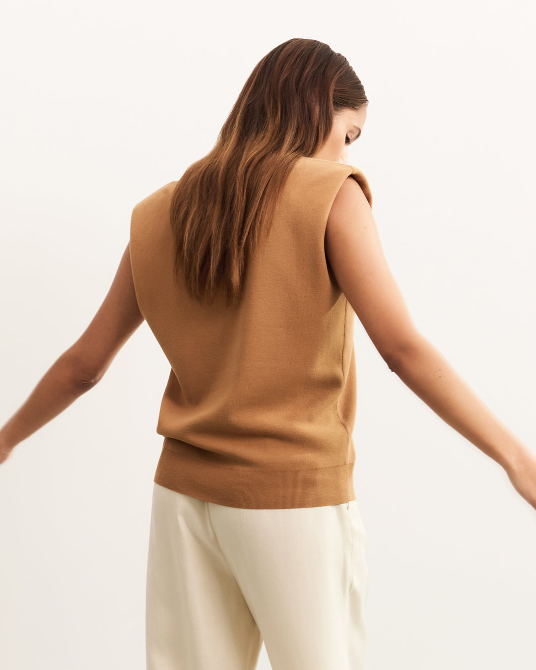 This elegant knitted spencer features a deep V-neckline and a button-down front. The subtle shoulder details add a modern twist to the classic design. Made from a soft and comfortable fabric, its relaxed fit makes it a versatile piece that can be styled both casually and chic. The model is 176 cm and wears size S.