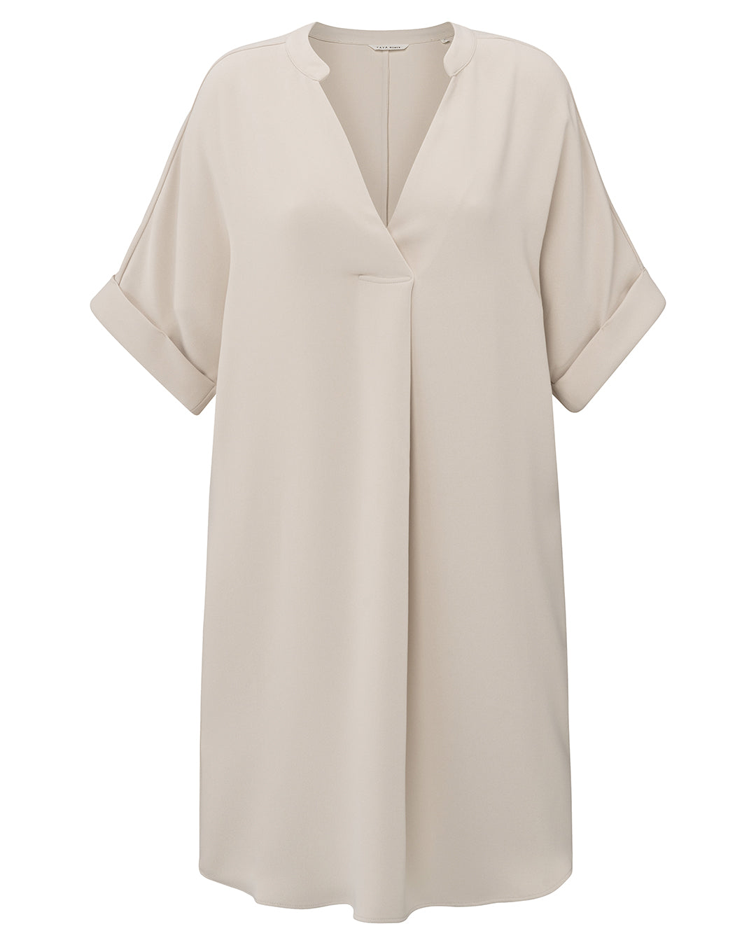 This stylish dress features a loose fit and is made from a soft, flowy fabric. Designed with a V-neckline with a subtle pleat and short sleeves with a folded hem for a relaxed look. The straight cut ensures a comfortable silhouette. Perfect for both casual and chic occasions. The model is 178 cm and wears size 2.