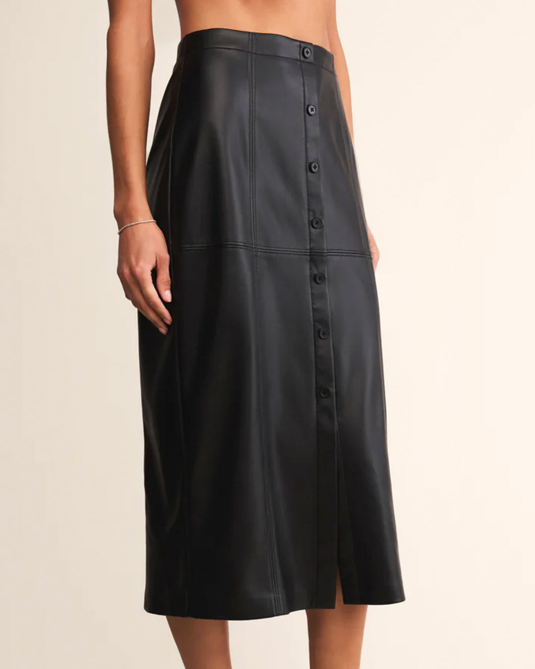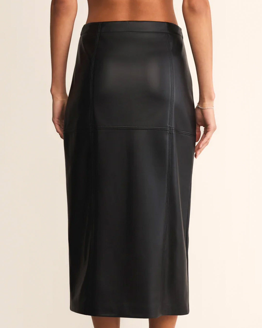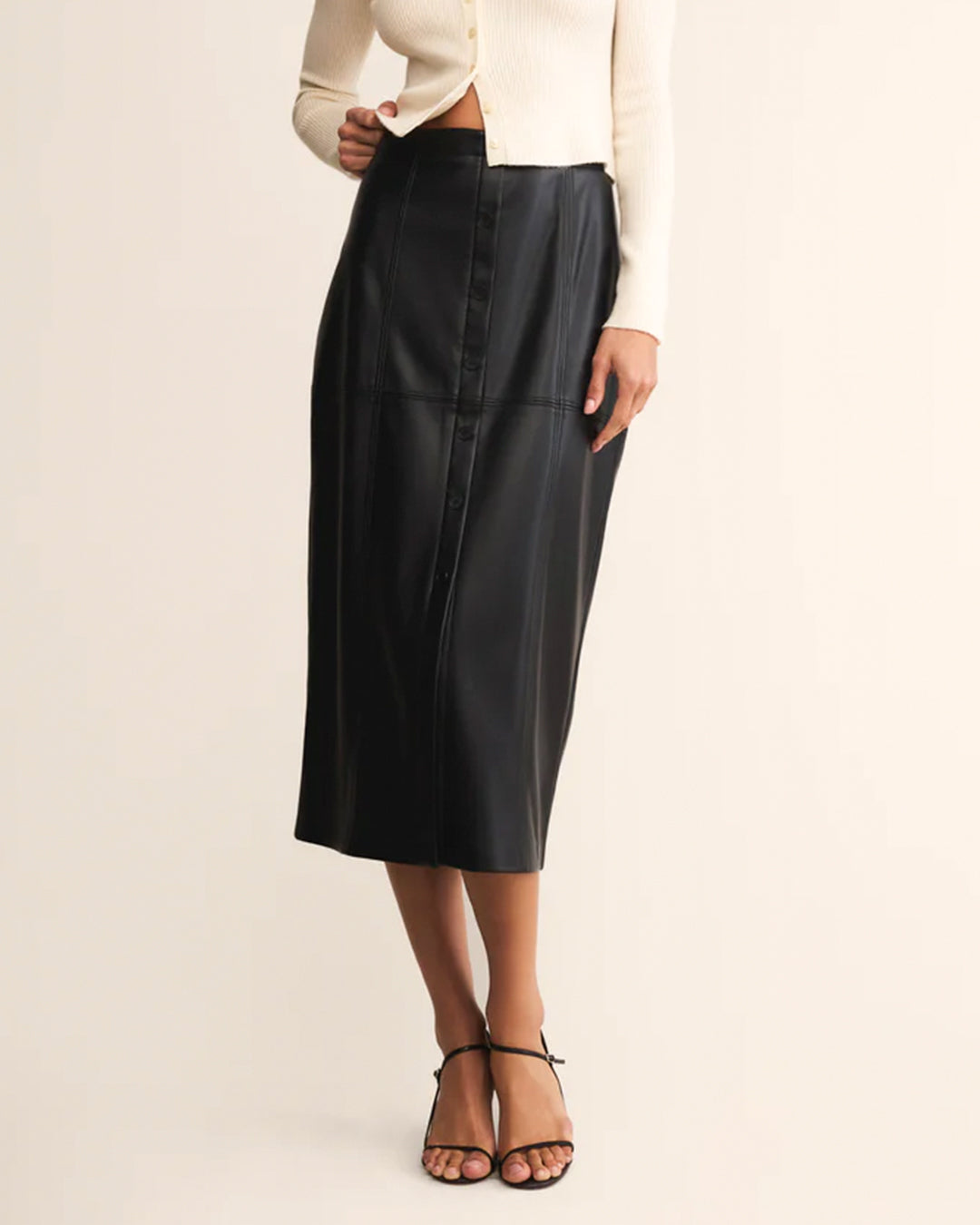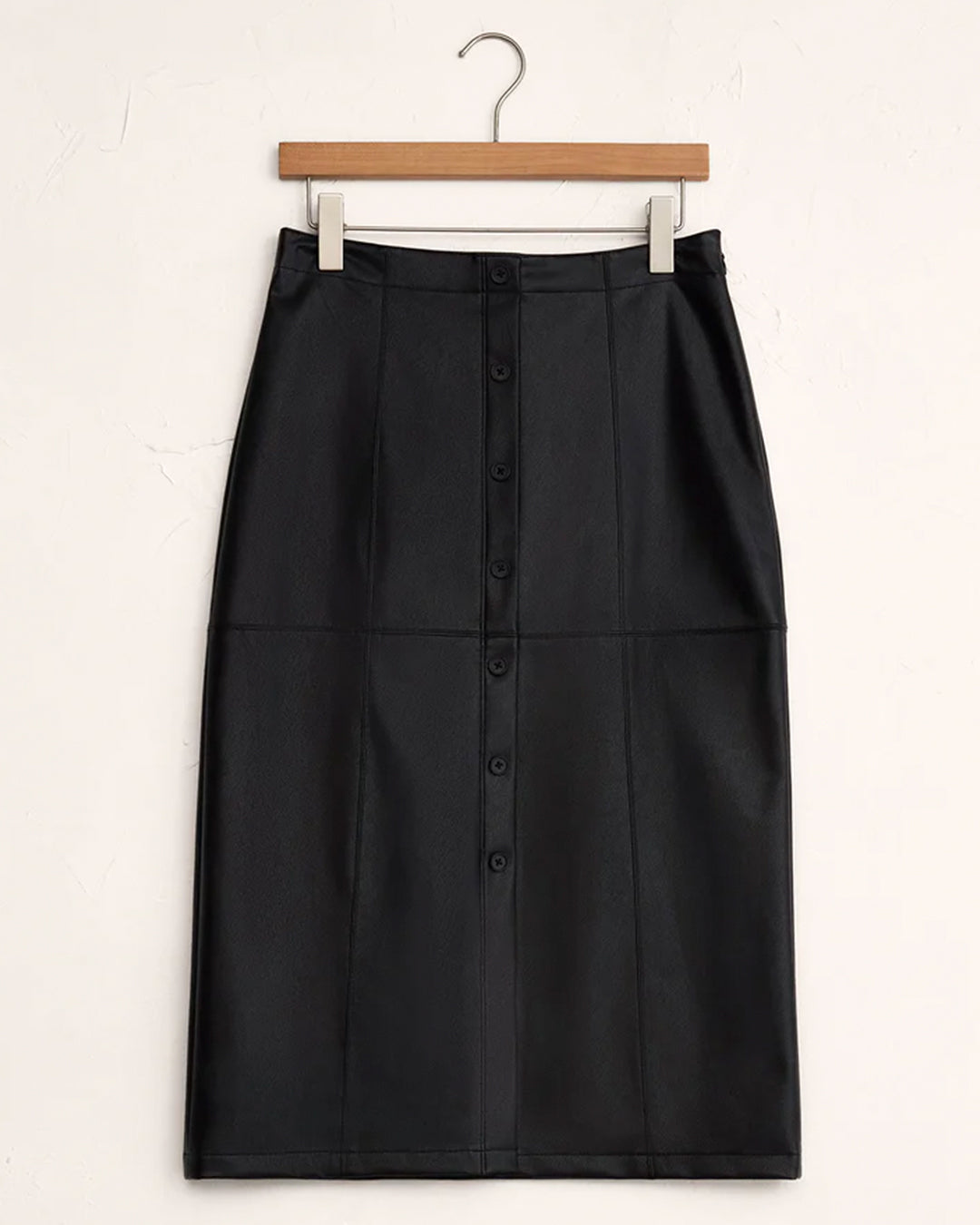 Modern and refined, this faux leather midi is tailored with a high-rise waist and smooth finish that skims the body. The invisible zip closure adds a streamlined edge, while the length makes it ideal for both office polish and weekend cool.