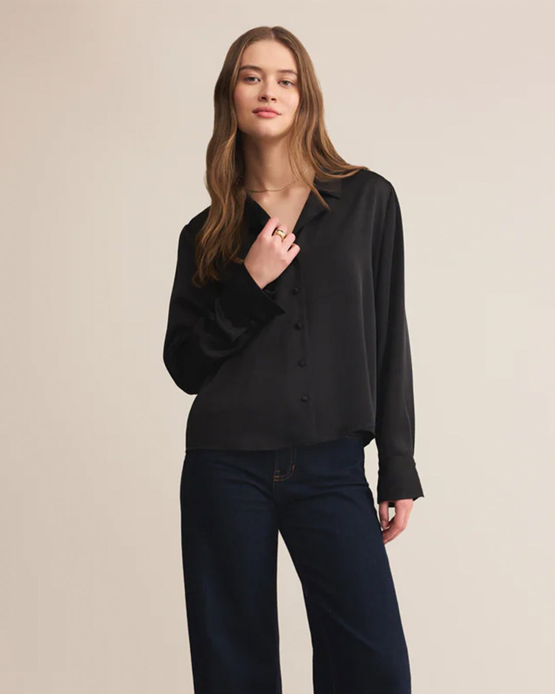This luxe satin top offers a relaxed fit with a collared neckline and button-front design. Its fluid drape and understated sheen make it a versatile staple for workdays or nights out.