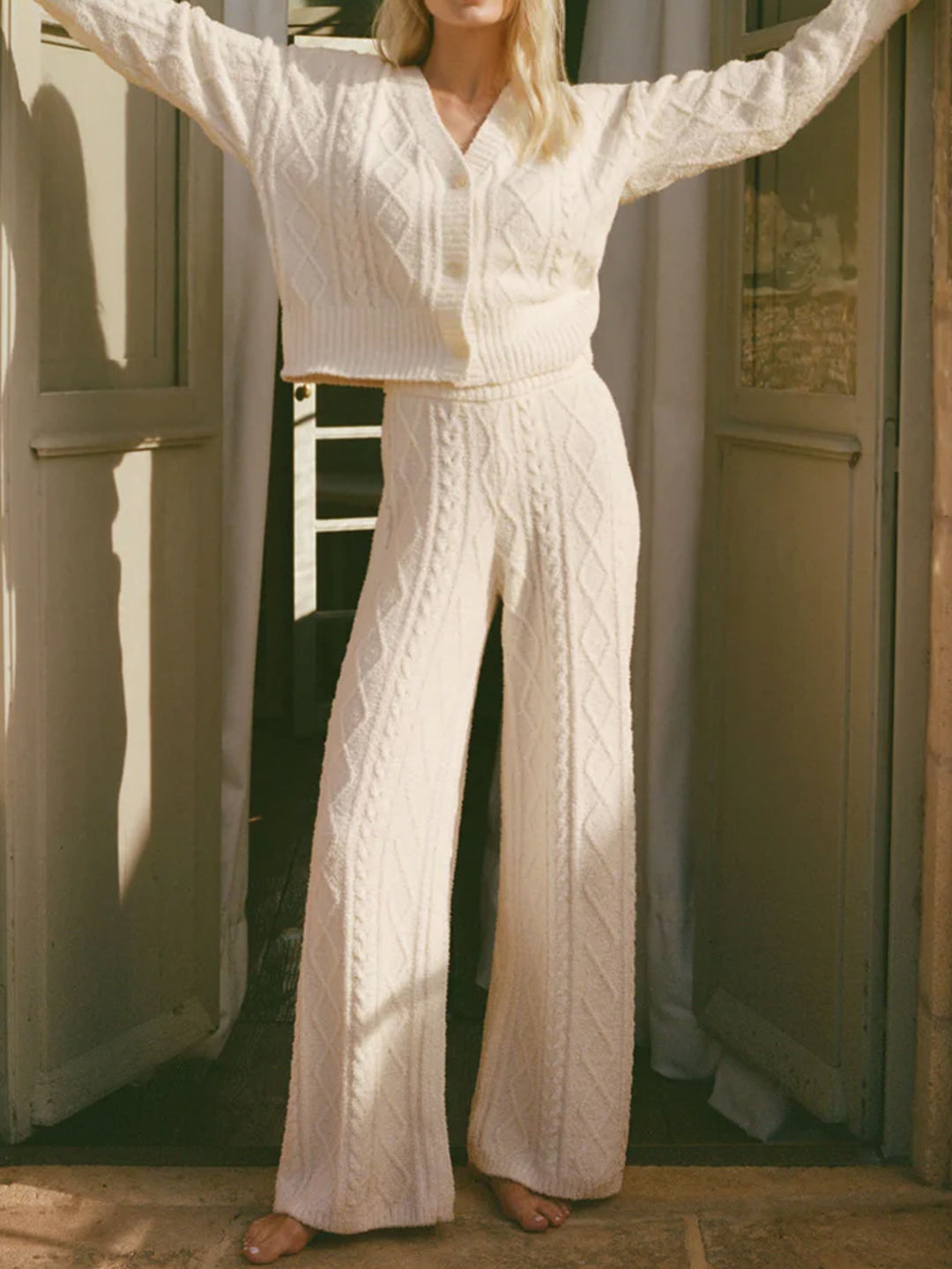 Knit from the same plush yarn as our Elsa cardigan, these cable pants deliver full-length softness with a relaxed, wide-leg shape. The elastic waistband keeps things easy while the texture adds a luxe lounge feel.