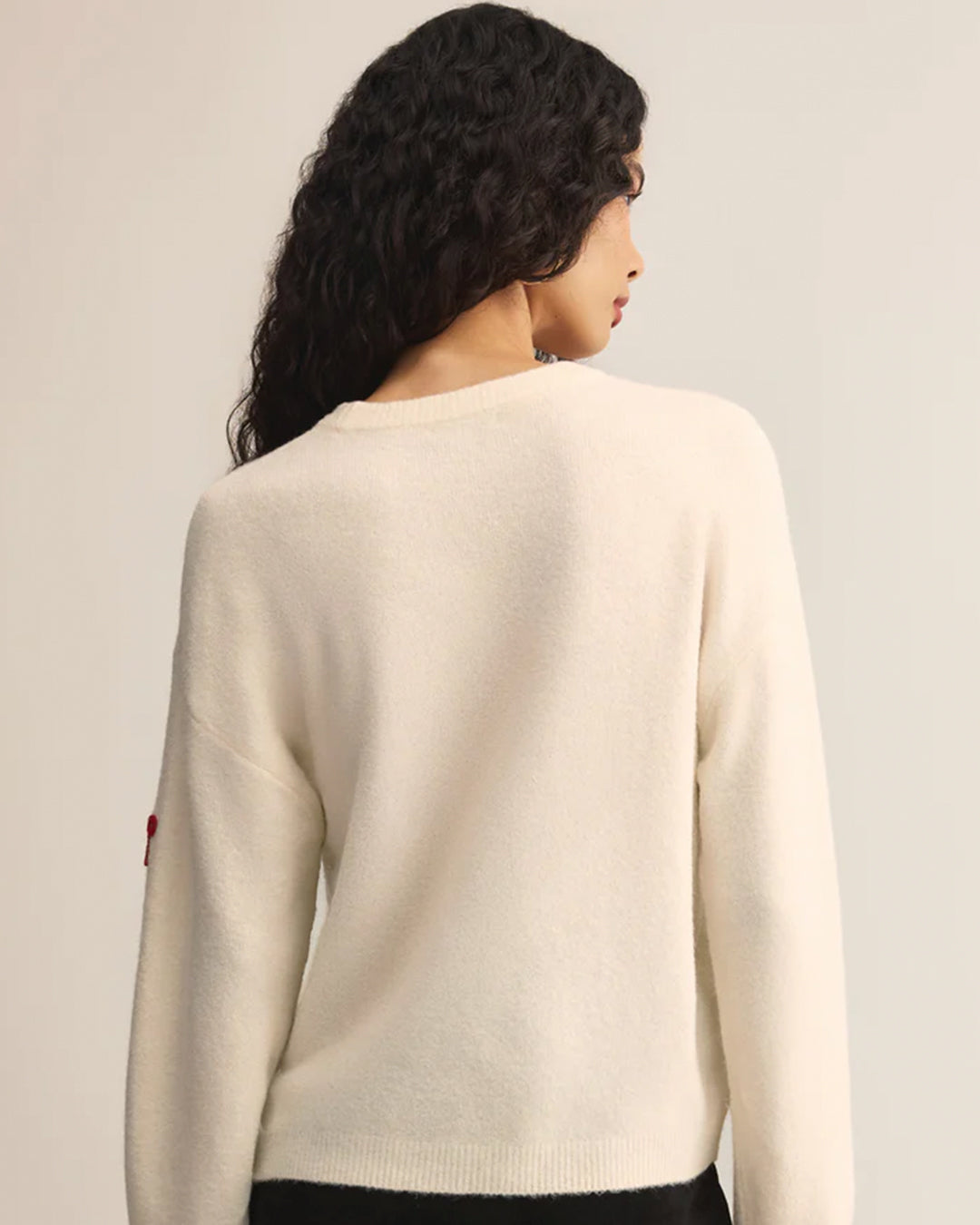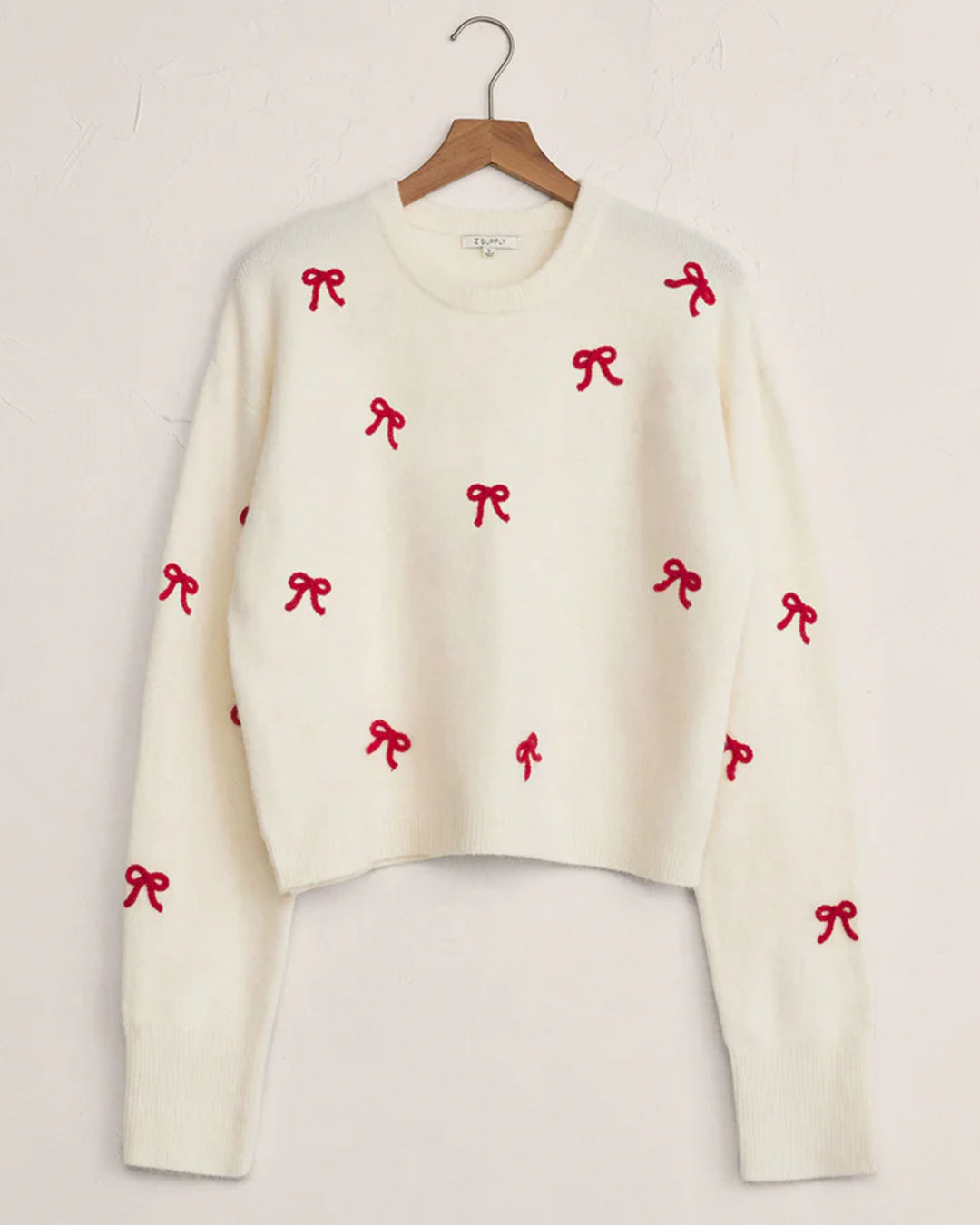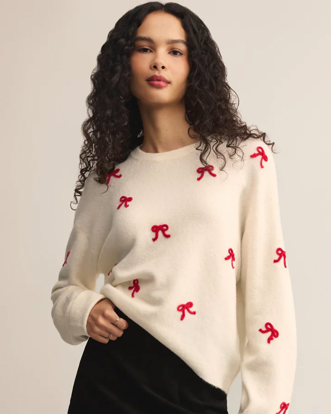 Playful yet cozy, this crewneck sweater is finished with delicate bow embroidery across soft yarns. Its relaxed fit makes it the perfect festive layering piece.
