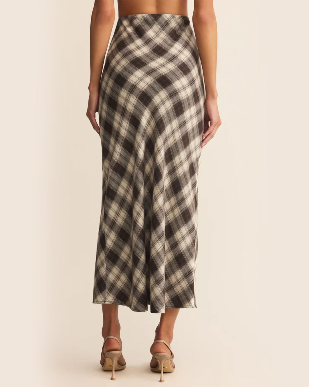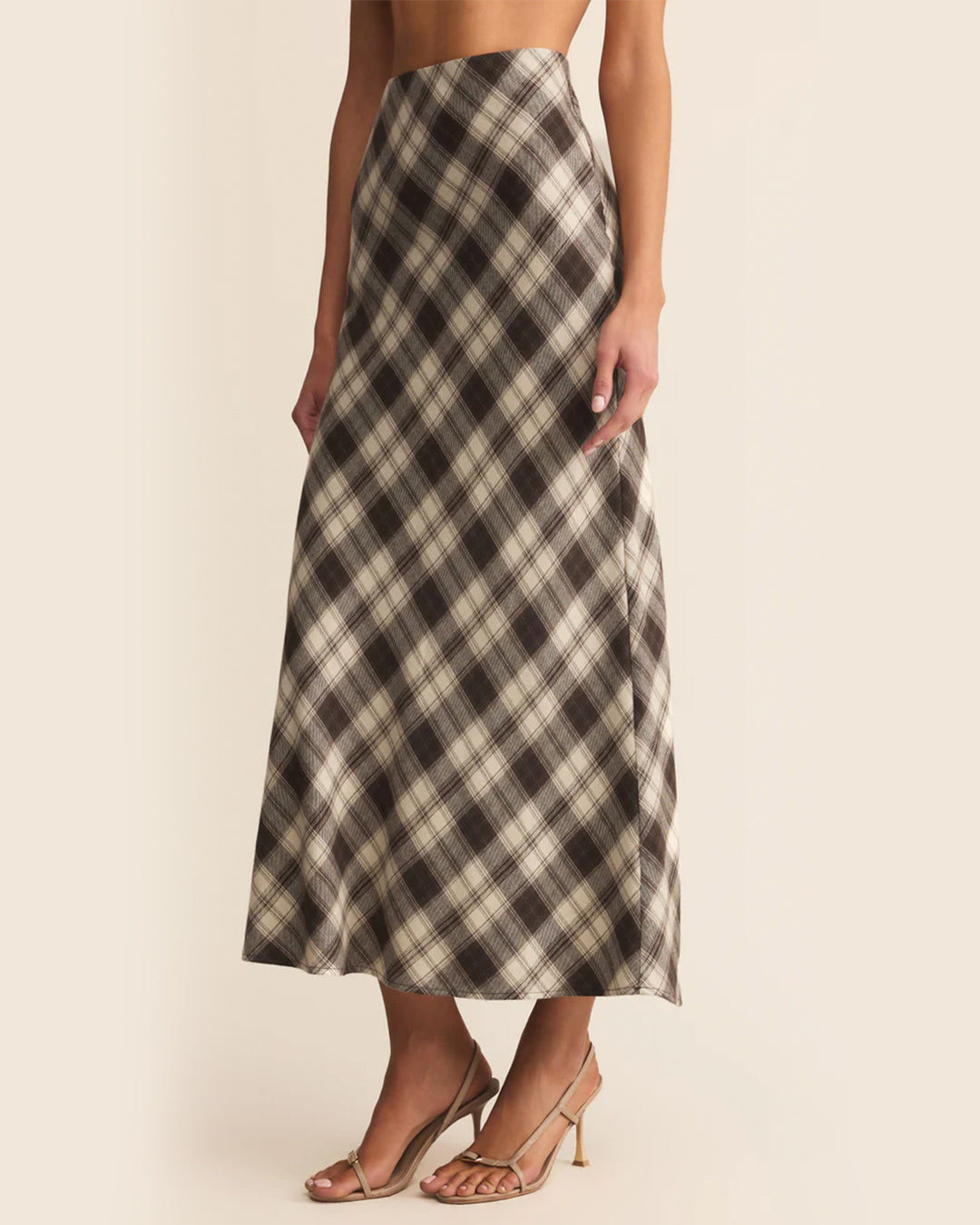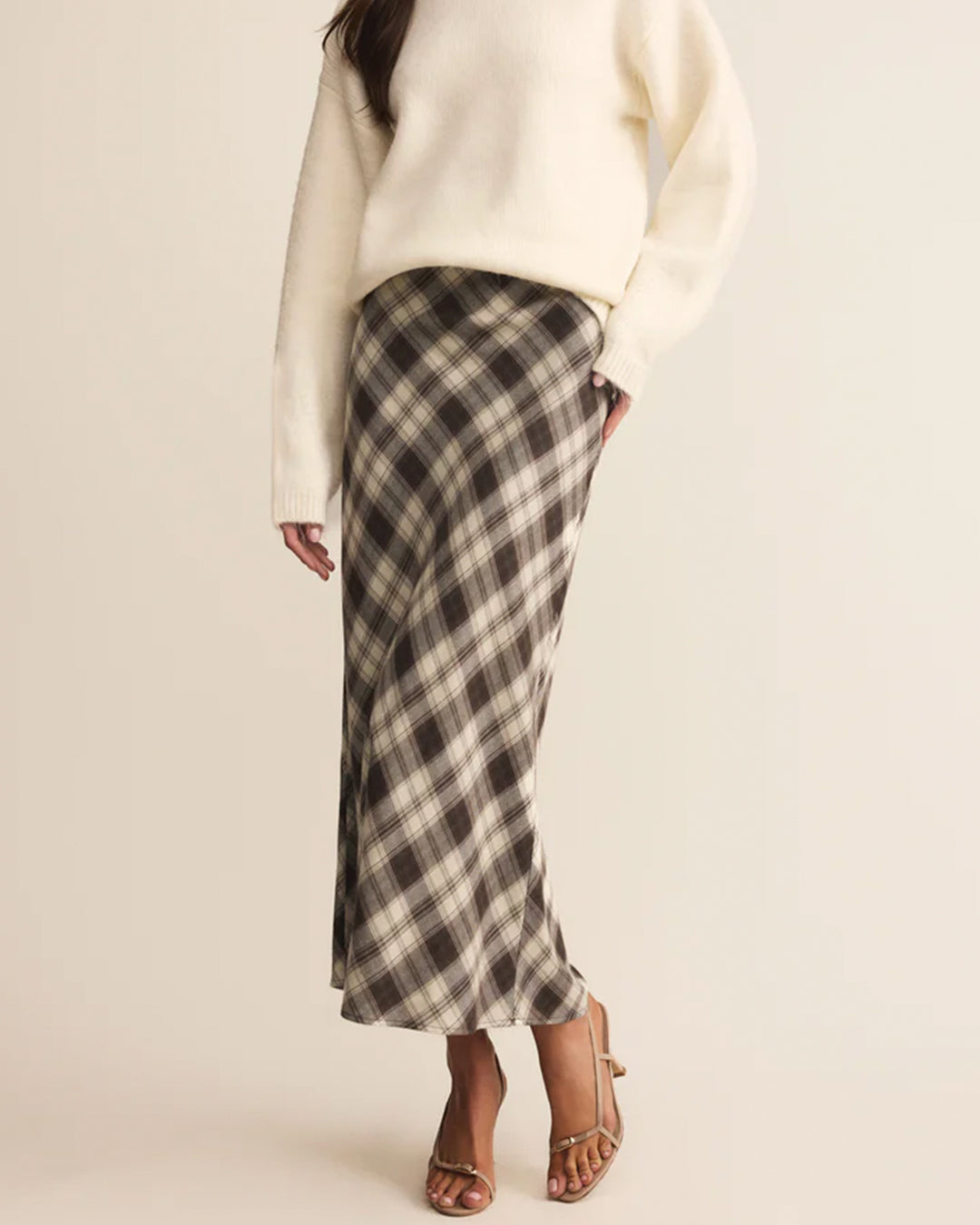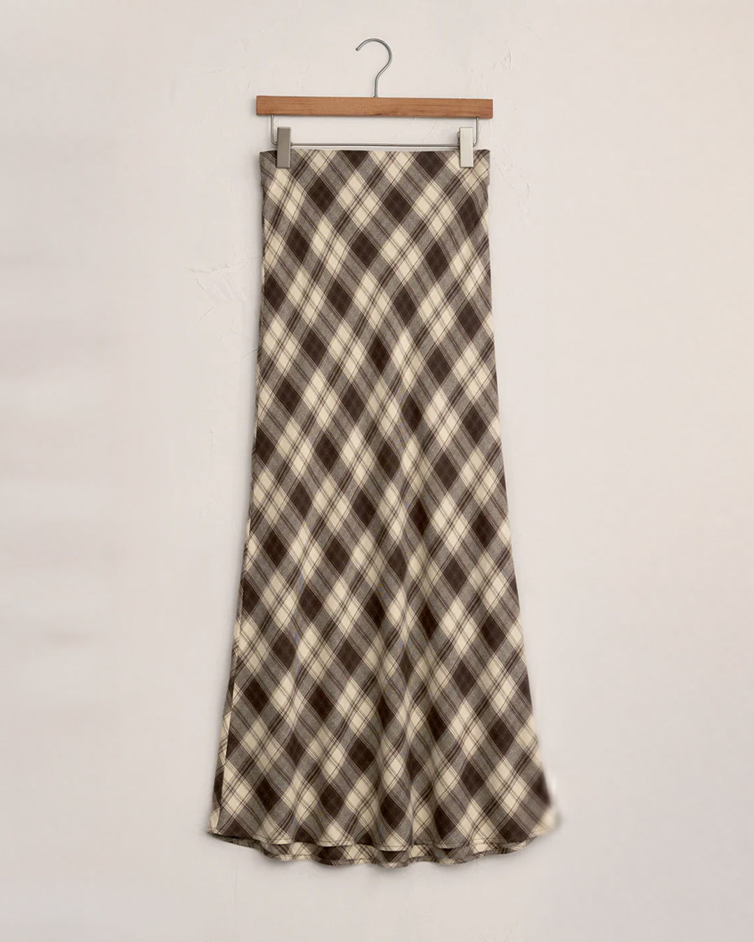This plaid midi feels both classic and fresh. The high-rise waist and elastic pull-on band keep it easy, while the timeless pattern makes it a go-to layering piece for cooler months.