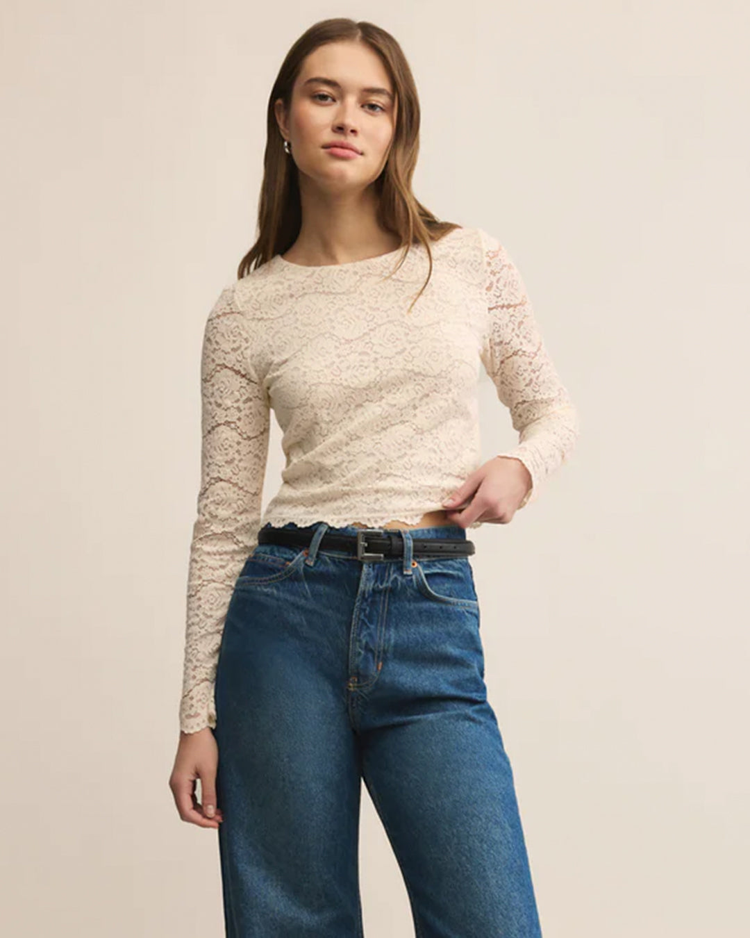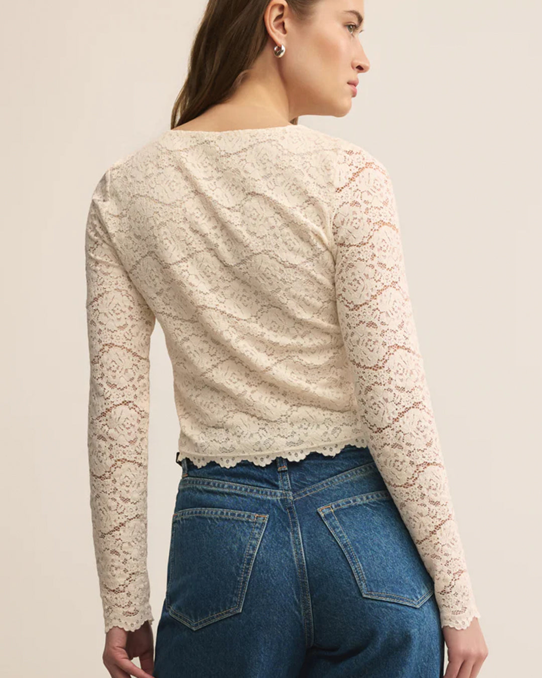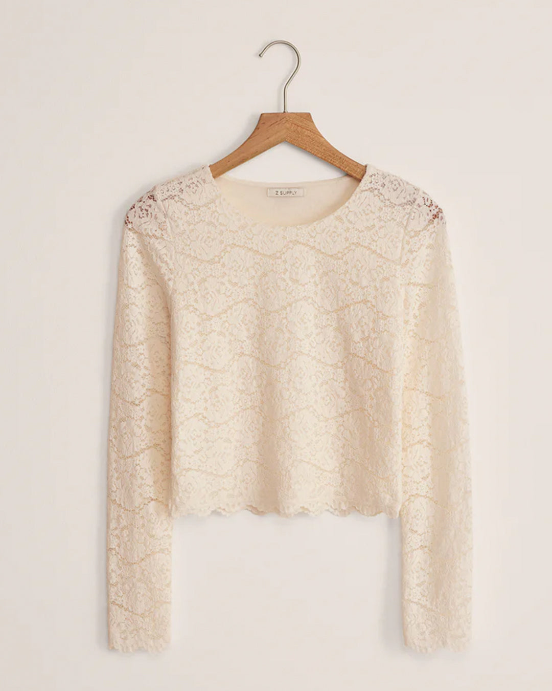Crafted from stretch floral lace, this fitted long sleeve features scalloped edges and a crew neckline for a polished finish. The semi-sheer design feels equal parts romantic and chic.
